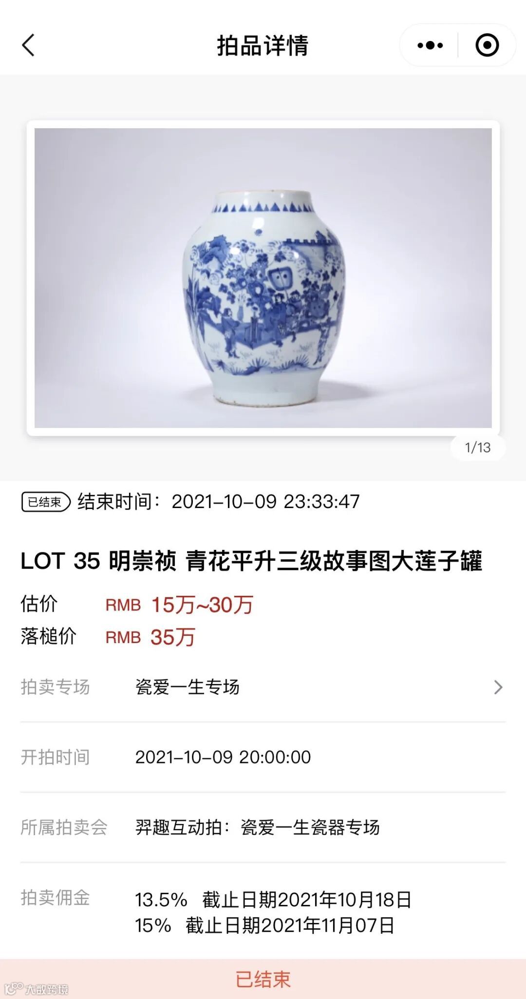LOT35 明崇祯 青花平升三级故事图大莲子罐一亮相,就引来网络平台的激烈竞争。拍品经过一番你来我往的争夺,最终以402,500元成交成为本场拍卖最高价拍品。