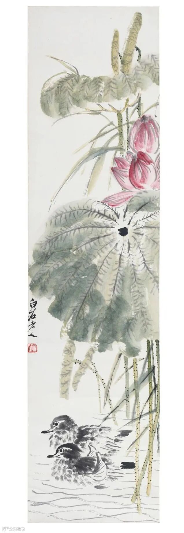 “荷花鸳鸯”是齐白石十分钟爱的题材,而以晚年成熟期创作的居多。齐白石曾有短句云:“老年心肠,不厌荷香。最怕牛羊,最喜鸳鸯”。以此可见画家好写荷花鸳鸯以贺结缡之喜。此幅《荷花鸳鸯》作于1952年,正值齐白石晚年,堪称齐派“红花墨叶”的经典佳构,雄健浑厚,笔墨酣漓,意趣盎然。此件拍品刚登场就引起了线上线下藏家,疯狂竞价。以30万元起拍,叫价一路扶摇而上来到89万元,最终以97万元落槌,含15%佣金以1,115,500元成交。