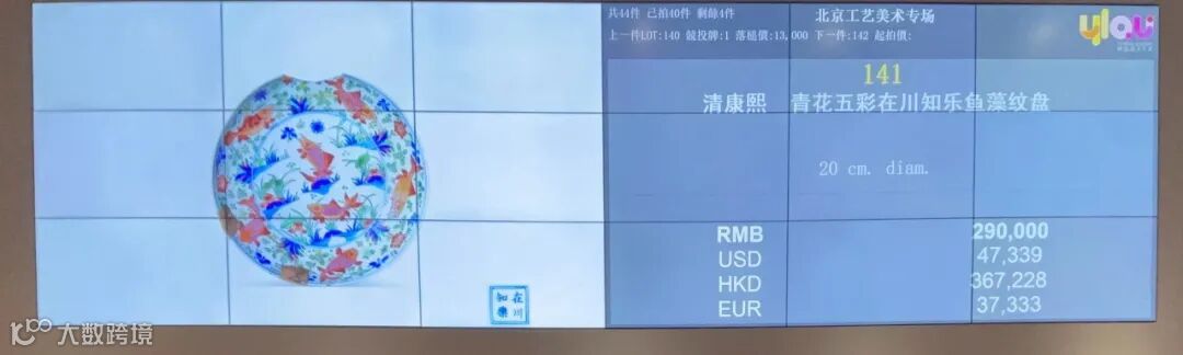 LOT141清康熙 青花五彩在川知乐鱼藻纹盘在预展期间就受到了广大藏友的热切关注。在开拍后更是竞价激烈,受到多位电话委托与现场、羿趣网络平台以及各大代拍平台等买家热烈追捧,各件拍品均不负众望,成交亮眼。最终以333,500元成交,拔得本场头筹。