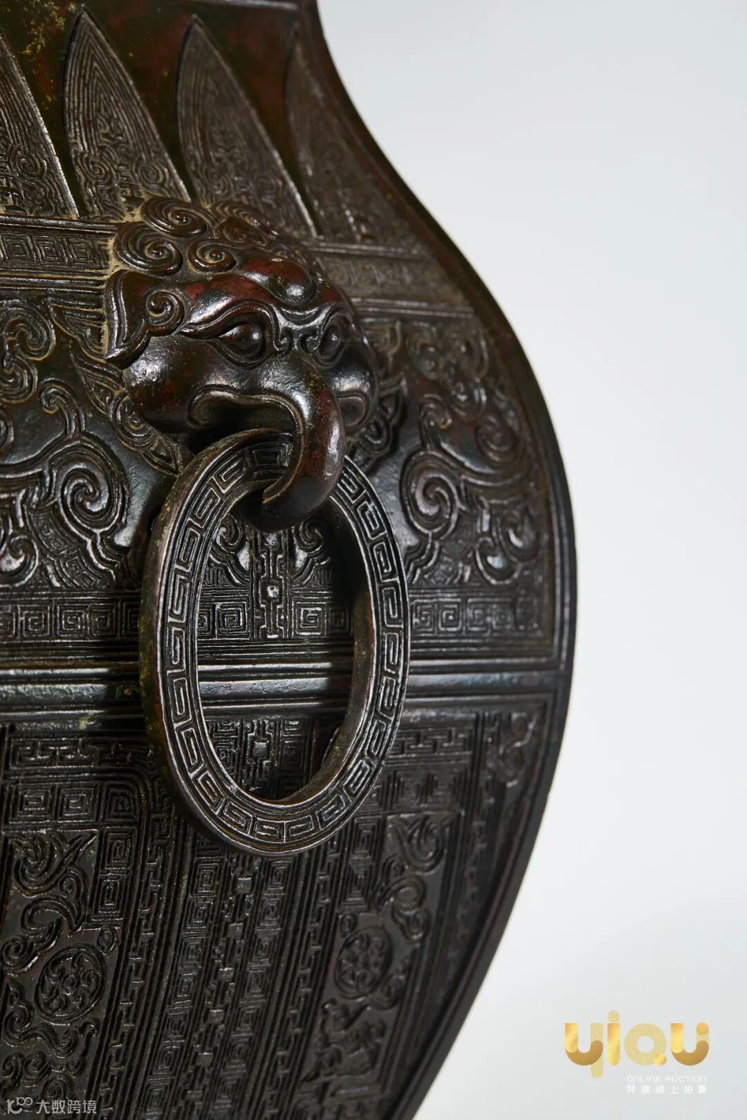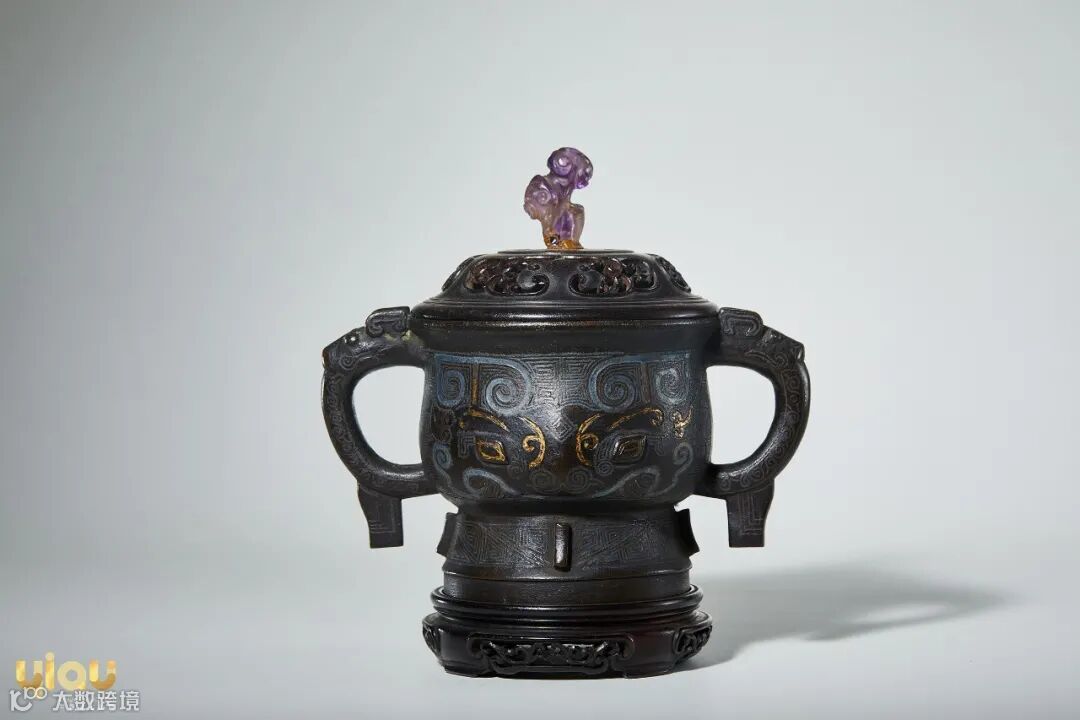 LOT136明铜错金银兽面纹龙耳簋式炉