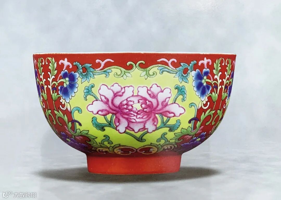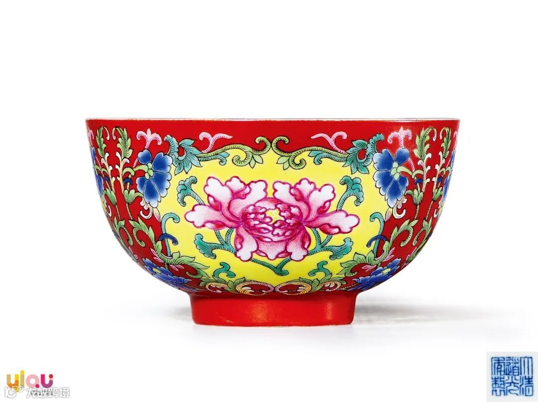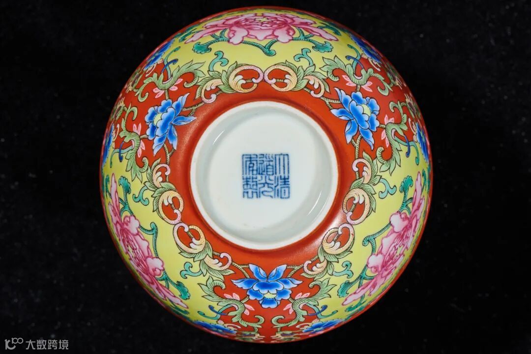 本品器形隽秀而娇巧,优雅而尊贵,胎体细薄坚致,内壁施白釉,温润莹美,外壁敷设珊瑚红彩为地,色泽匀净浓妍,以西洋洛可可式风格绘粉彩缠枝花蔓围呈两面开光,开光内铺以黄地,上绘并蒂牡丹纹。整器以红、黄相配,色彩强烈,施彩浓厚,颇为华美。西方风格的枝蔓与中国传统的牡丹结合,中西合璧,极富宫廷气韵。纹饰绘制细腻工丽,立体感强,红黄两色对比强烈,是典型的瓷胎洋彩器 「摹仿西洋」装饰特征。碗外底青花书“大清道光年制”六字三行篆书款,是清末宫廷中西结合之佳品。此碗其原型可上溯康熙珐琅彩制品。