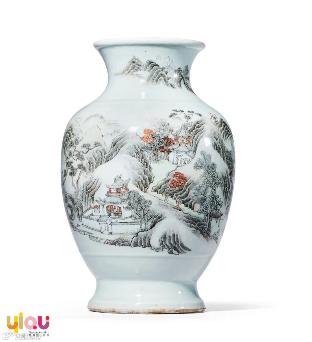 瓶广口外撇,束颈,筒腹,外撇圈足。釉面光滑莹润,通体以墨彩绘制山水楼阁图,虬松于山壑纵横间静息,点点楼阁亭台立于其中,山径之上偶有行人绰绰,通景布局疏朗,任何一个局部都是一幅优美的风景画,绘画精致细腻,颇具意境。清新典雅。