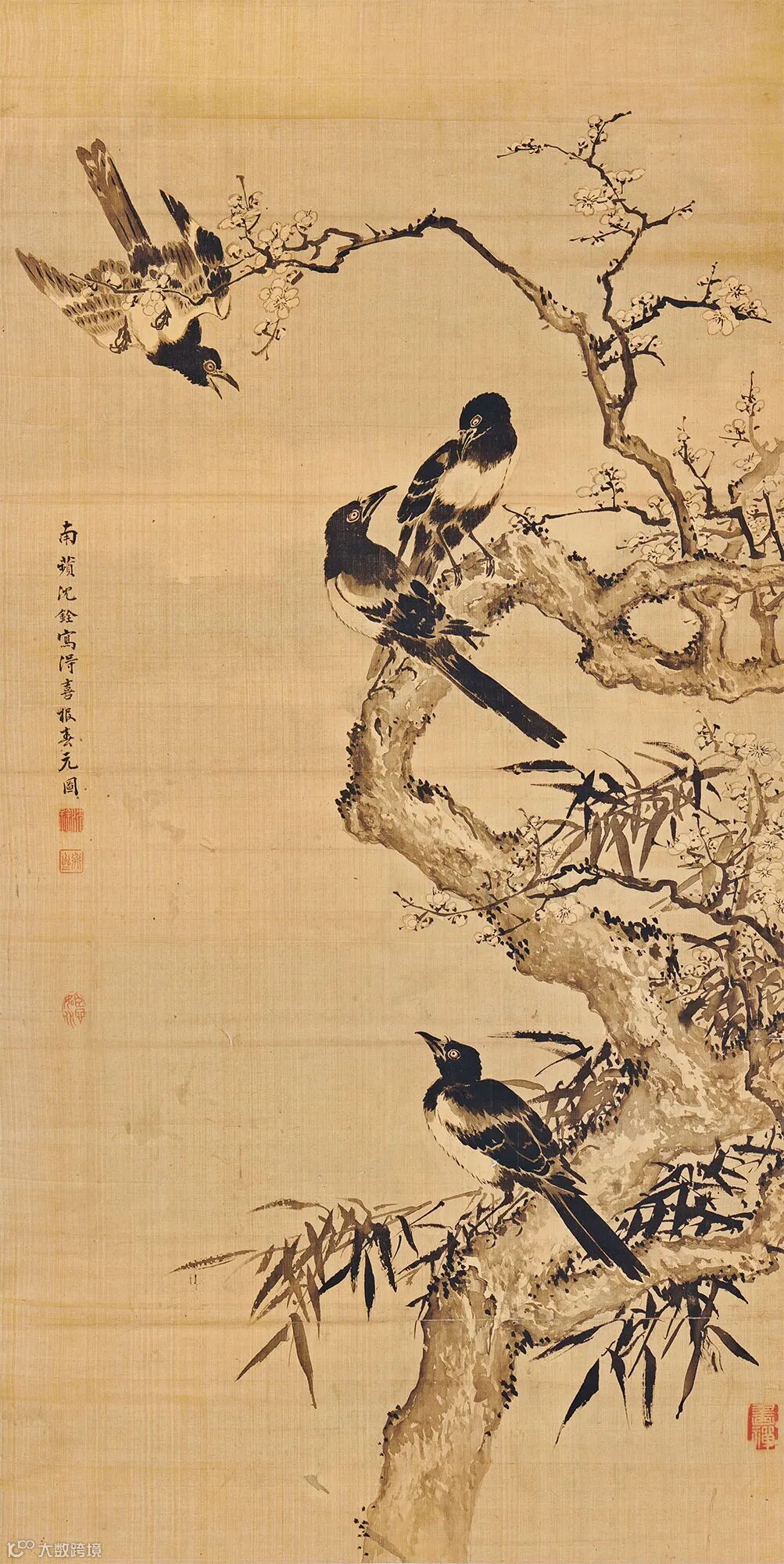 “四喜”原意是指旧时人们为庆贺和祈求人生的四大喜事,包括:人生福、禄、寿、喜。还有一种说法为“久旱逢甘雨,他乡遇故知,洞房花烛夜,金榜题名时”。后来文人画家以喜鹊入画,取其“喜”字,寓意深远。本幅所描绘的是春初冬雪消融,禽鸟活动,一片欣欣向荣的景象。画家以梅花与竹叶作为背景,安排四只体型硕大的喜鹊作为主角。它们与画眉、相思鸟等互相顾盼,有的蹲踞枝头,有的昂头回首,生动活泼的景象仿佛宣示着春天的来临。