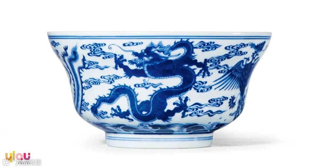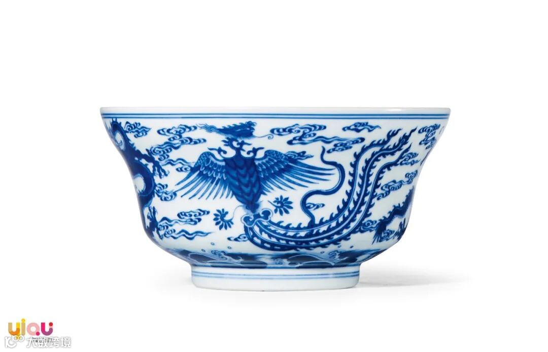拍品器形端庄典雅,胎体轻薄坚致,釉面光洁莹润,外壁主题纹饰龙凤纹,绘画精细入微,神形俱佳,绘画工致而古拙不足,寓意”龙凤呈祥”。