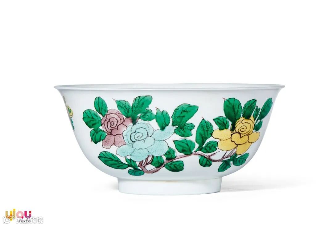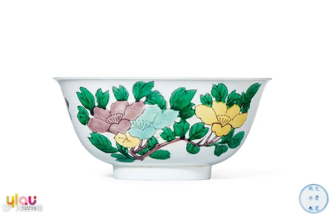 拍品撇口,深腹弧壁,圈足。其型端正大气,口沿外撇并略向下翻卷,足墙根部略呈弧形,为本类器物特征之一。整器胎质细腻,胎体轻薄,外壁暗刻双龙赶珠纹样,其龙体矫健,龙爪锋利,昂首怒视,威风凛凛。刻划龙纹之上以娇黄、嫩绿、绛紫等诸彩绘制折枝花卉两株,花朵饱满,枝叶繁茂,花丛之间还有两只蝴蝶飞舞穿梭,整体绘画于暗刻龙纹之上,装饰意趣极为考究,为典型康熙御窑名品;碗底双圈内青花书“大清康熙年制”六字双行楷书款。