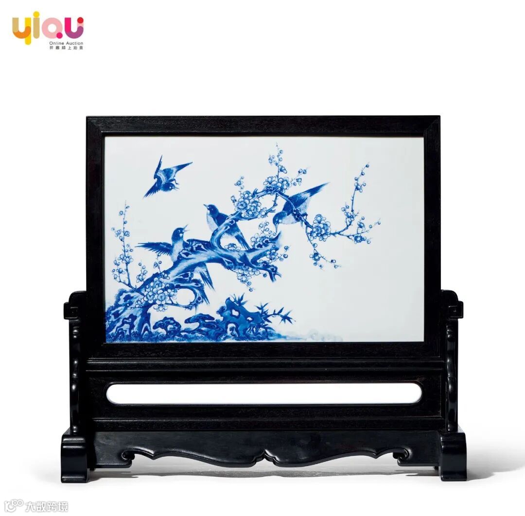 此屏呈长方形,外框取红木为材,内部嵌入瓷板为饰。屏面以青花绘饰一幅四喜图,挂屏下部梅花绽放,四只喜鹊立于树上鸣叫,一派热闹的春意景象。