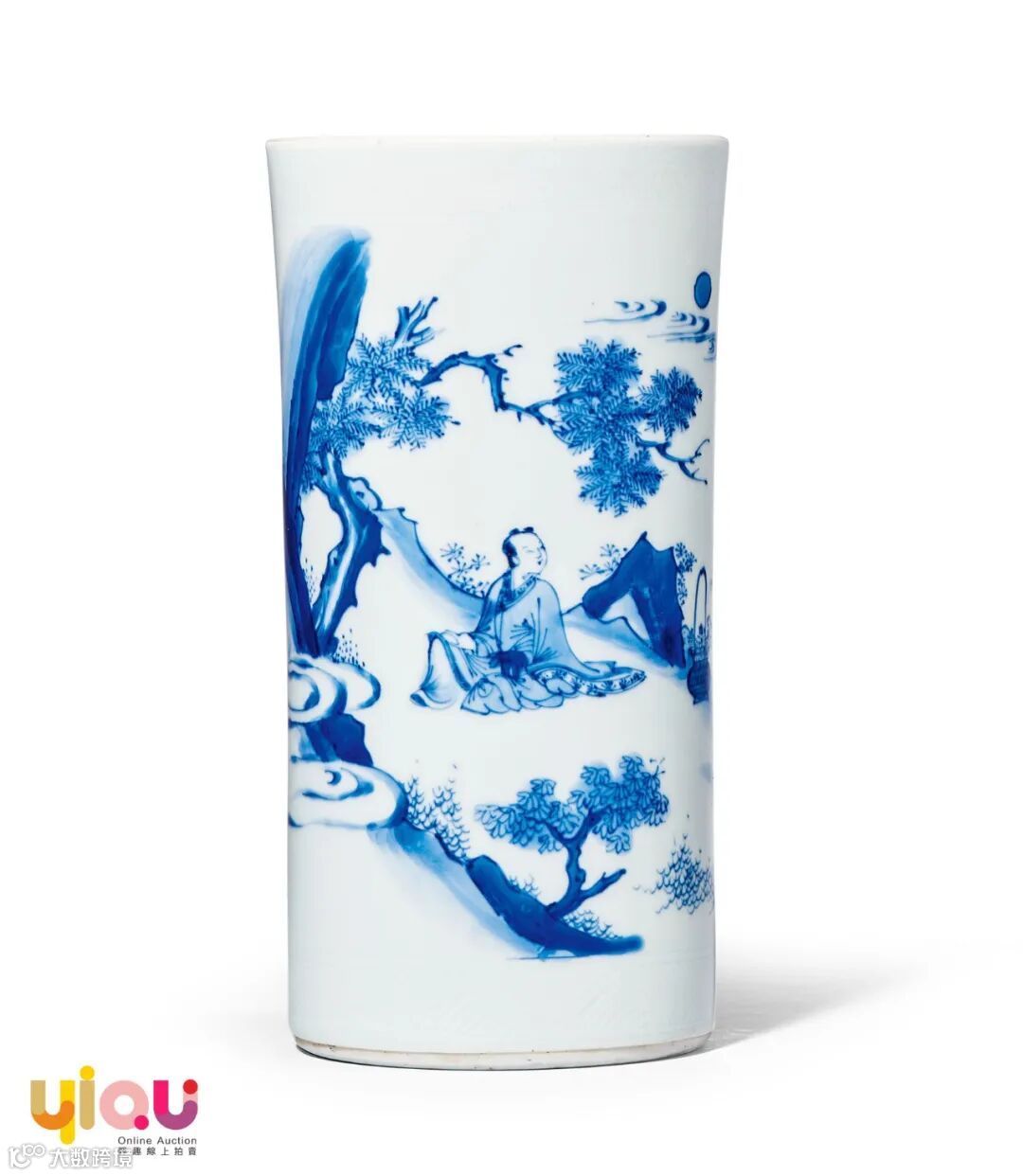 笔筒通景以青花绘饰人物故事图案,高士隐逸,衣褶流畅,渲染自然。背景衬以树木山石,水波流云。釉质清亮,青花发色青翠艳丽,浓淡渲染层次分明,纹饰描绘精细。口沿及近足处暗刻纹饰一周,俗称“暗花边”,此种装饰手法在天启、崇祯时期颇为流行。