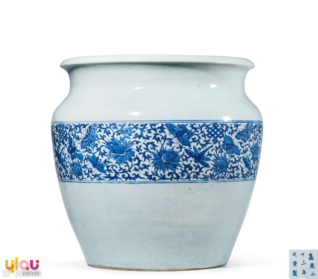 拍品器型沉稳,胎体厚重,外壁腹部绘青花花蝶纹饰,花朵盛开,枝叶翻卷,花蝶翩跹,构图流畅自然。给人以一种轻松、舒适、自由的感觉。置之书房,可赏可玩。