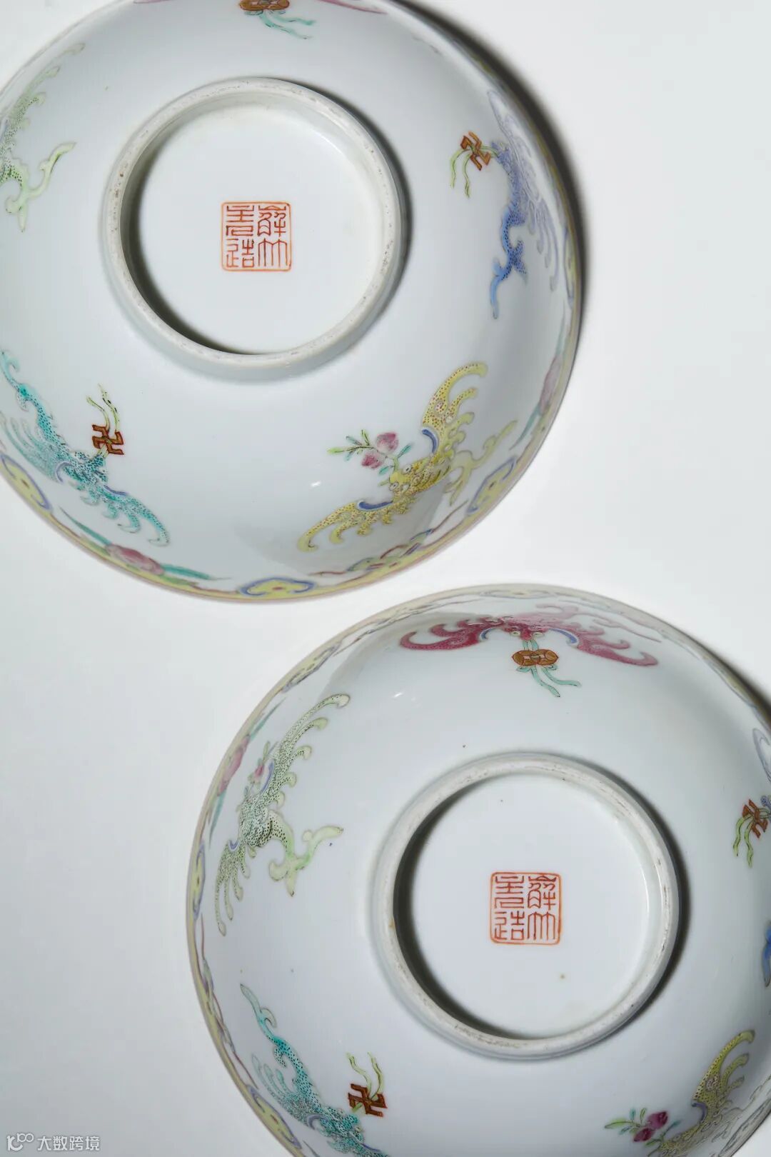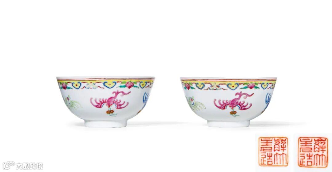 此对碗小侈口,斜曲腹圈足。外腹口沿向下依次饰弦纹、如意寿桃纹、夔凤纹,寓意吉庆如意、福寿万全。粉彩绘夔凤色彩交织,异常丰满。胎质细腻,彩绘描画精细,画面美轮美奂,赏心悦目,构图满中有序,纹饰繁华富丽,通体可见喜庆吉祥之气氛,令人喜爱。