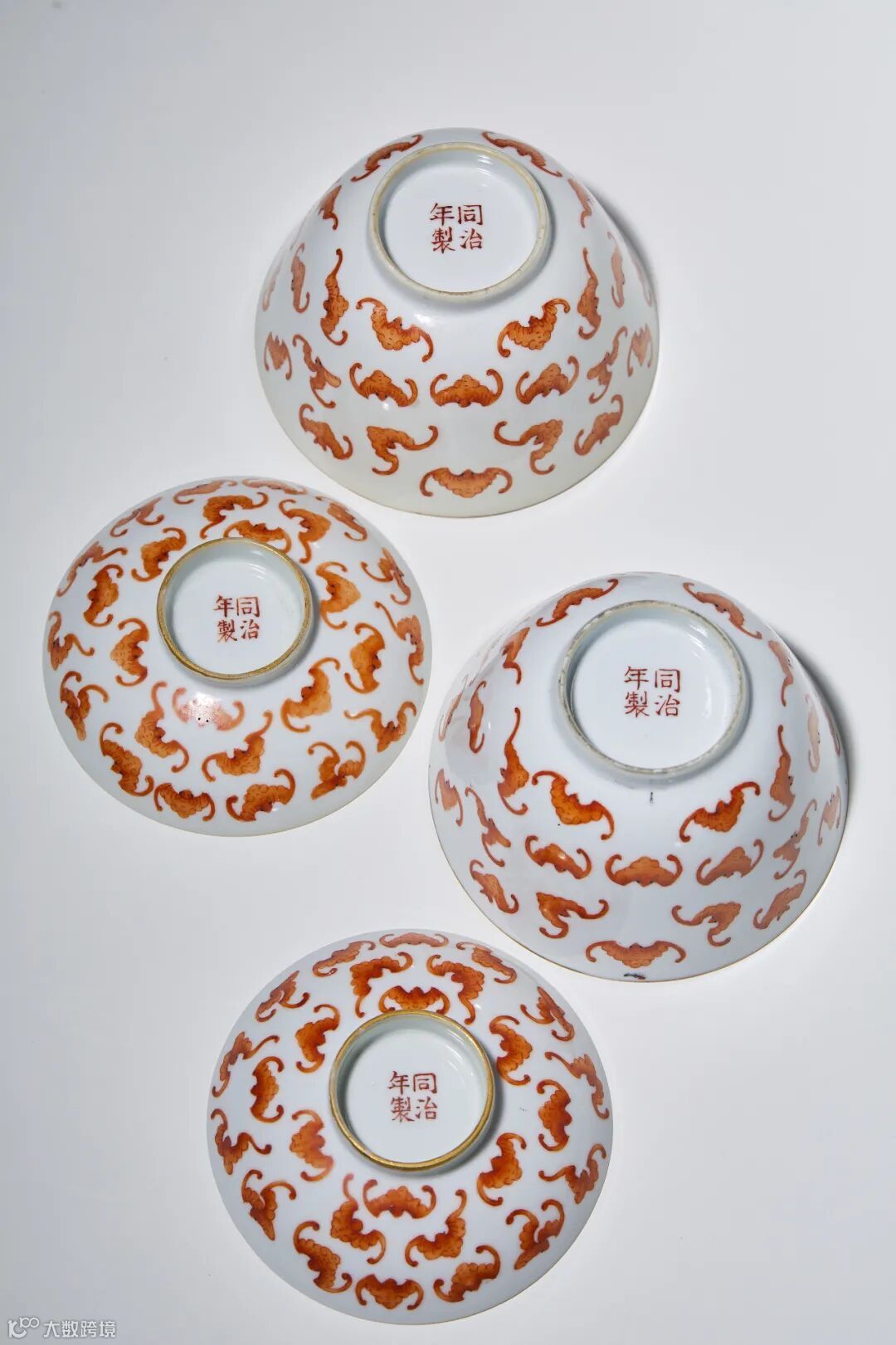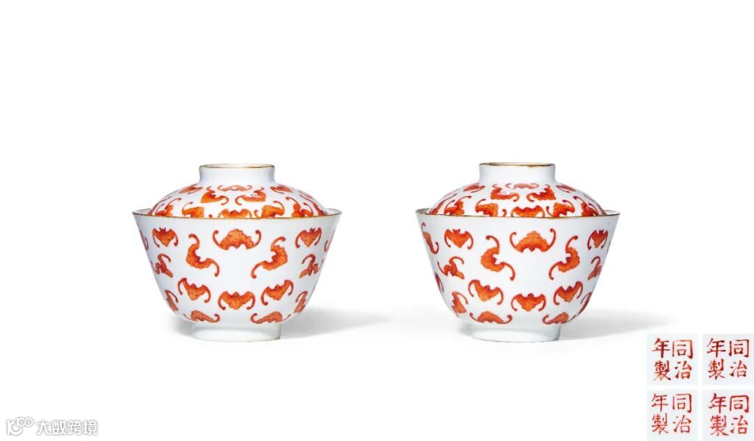 此对盖碗由碗身、碗盖两部分组成。盖沿及碗口均描金,盖面及碗外壁用白釉为地,釉色洁白干净,其上用矾红满绘蝙蝠纹,纹饰满布器身,密而不乱。碗、盖的底心均用矾红彩书“同治年制”四字双行楷书款,结字工整。因“蝠”与“福”谐音,寓意洪福齐天,百蝠一直是清代喜闻乐见的吉祥题材。此对碗形制规整,工艺精细,红彩鲜艳明亮,所绘制的蝙蝠图案错落有致,疏密得当,姿态各异。