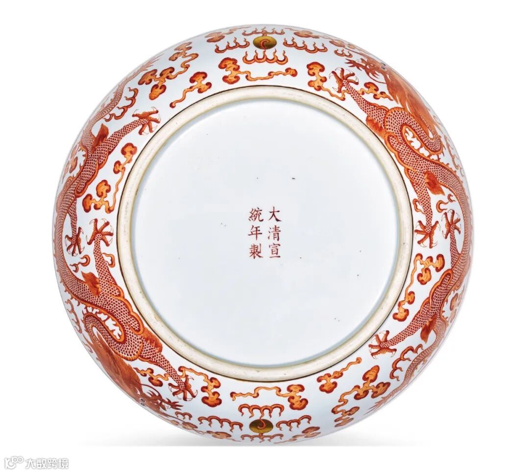 拍品敞口,弧壁,圈足。通体施白釉,釉面光润。盘心矾红彩绘双龙戏珠,并以金彩描绘双龙身躯、云纹及龙珠,金光熠熠。双龙身形矫健,鬃鬣飞扬,鳞片历历,张牙舞爪,展现威风凛凛之态。圈足内书“大清宣统年制”六字双行楷书款。此种纹样为明清官窑经典样式,深受晚清帝王的喜爱。