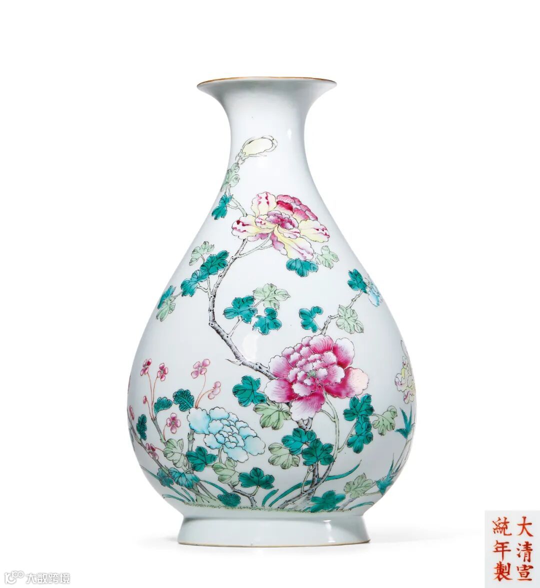 拍品撇口,细颈,硕腹,圈足外撇,瓶体由有变化的弧线构成,器形显示出柔美匀称的装饰感。外壁粉彩绘通景花卉纹饰,色彩淡雅,笔触细腻,呈现了一派春意盎然,充满生机的画面,纹饰部分先勾勒轮廓,再添粉彩,一丝不苟。花卉部分彩料甚厚,除描绘之外,花瓣处还加刻划工艺,用以表现花卉花蕊的细部特征,尽善尽美。底书红彩“大清宣统年制”六字双行楷书款。全器立意高雅,色调清新,胎质细洁坚致,釉色晶莹温润,为一件宣统官窑佳器。类似作品在北京故宫博物院有收藏。