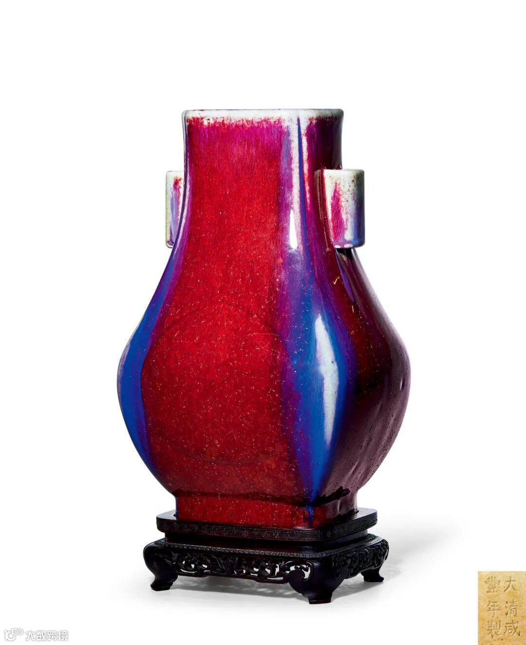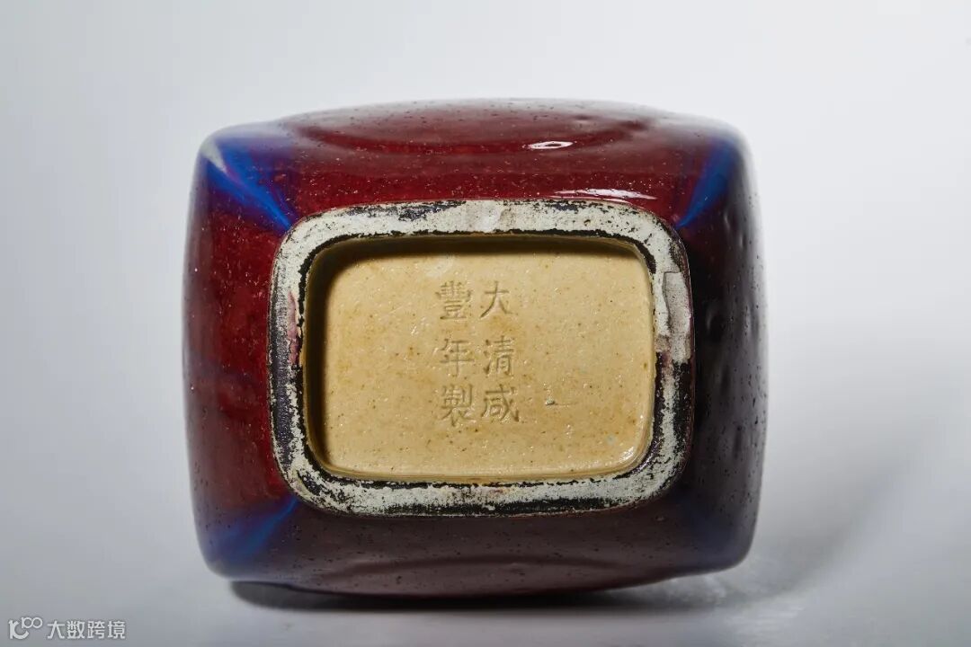此件形制仿自汉代投壶,呈四方倭角形,颈部两侧对称贴塑贯耳,鼓腹,长方形圈足。通体施窑变釉,釉汁肥厚斑斓,其间融入丝缕蓝釉,红蓝相间,斑斓交融,灿若晚霞。足内施酱釉,底心阴刻“大清咸丰年制”款。整体造型俊秀,挺拔大方,釉汁流淌自然,极富凝重古朴之感。保存良好,殊世罕见。