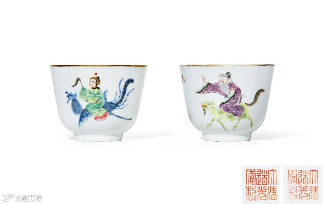 本对拍品造型雅致,斜壁,圈足,口沿描金一周,胎体洁白,色泽润腴,通体施白釉,外壁轧道海水纹,上以粉彩绘仙人图,整器造型简练优美,色彩鲜艳亮丽,绘画精细素雅,彩料厚薄均匀,为文人雅士所喜爱,底部红彩书“大清道光年制”六字三行篆书款。