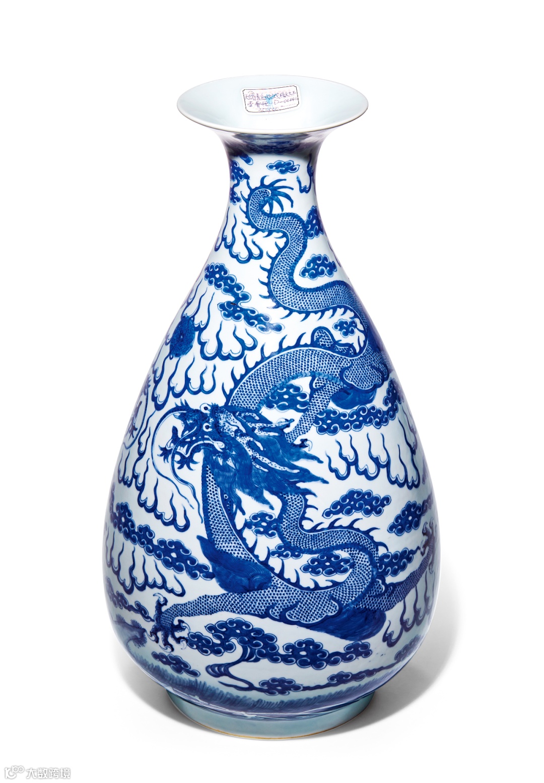 口沿外撇,细颈,圈足,器形优美,胎质细腻。主题纹饰为云龙赶珠图,龙纹刚劲有力,张牙舞爪,近底处绘海水纹,苍龙腾于祥云之上,尽显威武之躯。气势恢宏,锋芒毕现,绘制层次清晰,青花发色青翠典雅,釉面肥厚滋润。绘画精细,笔意娴熟,构图疏密得当。玉壶春瓶源自宋代酒器,是中国瓷器最传统的造型之一,一向以体态优美著称,明清之际,为宫廷装饰之名品。