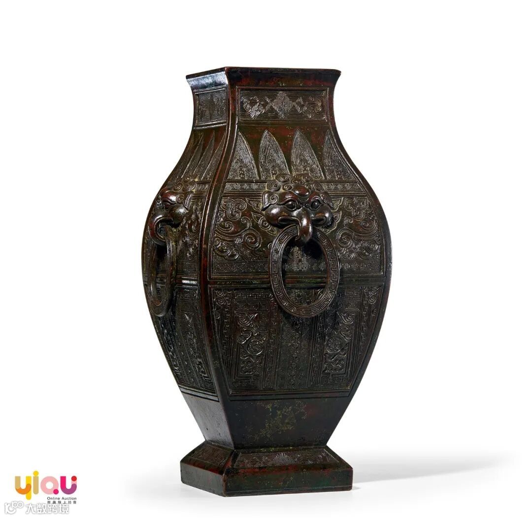 此件方壶为仿汉时青铜器方壶造型,静观视之,古朴浑厚,予人以沈静素雅之美。平面正方,加厚的唇口平而外侈,颈部挺拔微敛,转而溜肩下滑,丰肩深腹,,鼓腹下收,圈足颇高,方正略侈,肩部两侧铸衔环铺首,两侧铸兽首口衔环,铺首耳圆雕,额角硕大,圆目环口,内穿活环,兽首造型独特,目光炯炯,颇为传神。口缘、颈部、腹部分四层分饰几何纹、卷云纹、兽面纹等多样纹饰,腹部内底填充勾云纹与如意回纹,纹饰繁缛,錾刻精细,层次分明,可谓精美无比。整器以精铜为材,包浆自然,色泽幽穆,冶铸精工,一丝不苟。如此方壶,厚实端庄,器型周正,庄严中透出韵美,古拙中带有灵动之美,尽显仿古之器的大气稳重之感。可观赏,可收藏,自是一件极佳的古代艺术品。