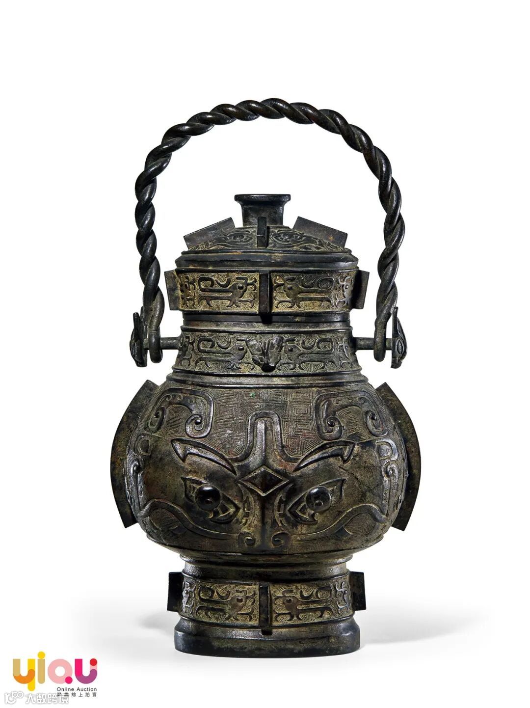 卣为盛酒器,盛行于商代和西周。《诗经大雅江汉》中有『厘尔圭瓒,秬鬯一卣』的诗句,意思是『赐你圭柄玉瓒,香酒一卣』。此器器体厚重,绳纹提梁。口微外撇,颈稍收,腹壁圆曲,垂腹明显,圈足底部外撇作高阶状。器盖、腹、足部皆做四道棱脊,颈两侧设置活络式样提梁,提梁两端作羊首形,颇为立体精湛。盖面、腹部以隐起如意纹为地,上饰凤鸟纹、兽面纹,兽面圆睁双目,气势威严。高圈足外部两面各装饰相对称的凤鸟纹,多层次的雕饰上下相称,尽显整器尊贵典雅之不俗气韵。整器工精致,线条流畅自然,通体花纹富丽繁缛,布局精巧,装饰性极强。望之典雅熟润的铜质,给人以威严庄重之感,置之高斋,足供清赏,殊宜珍视。