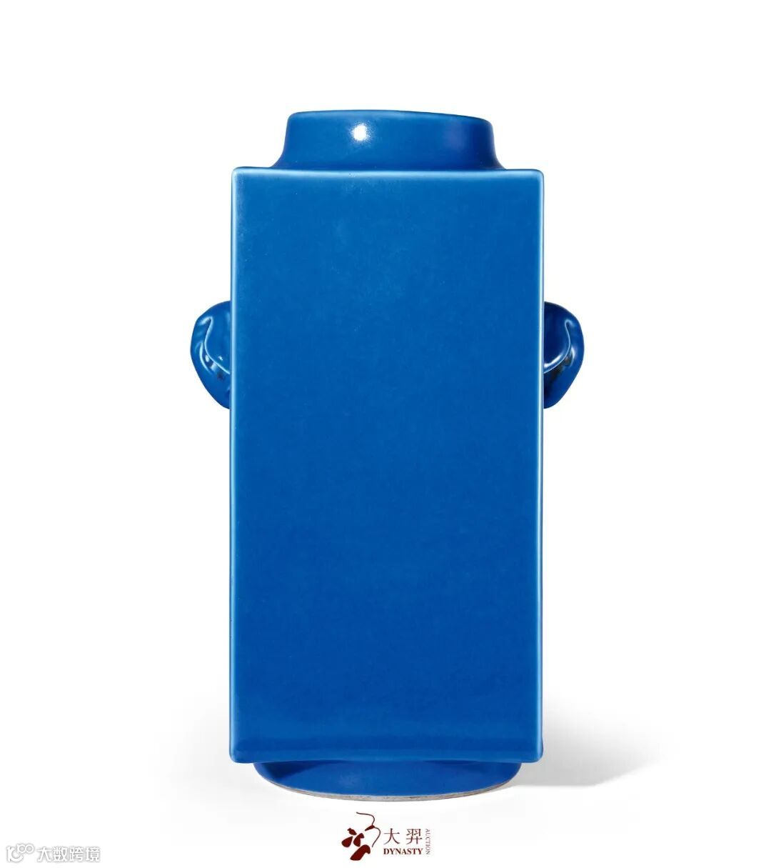 拍品方瓶乃仿新石器时代玉琮制式,此种造型的瓷器创烧于南宋官窑和龙泉窑,蓝釉象耳琮式瓶自乾隆朝开始流行,以后历朝均有烧造,为清代官窑传统品种。因瓶谐音“平”,两侧饰象耳,故有“太平有象”之吉祥寓意。本瓶遵循传统制式,制作规矩,体量适宜,制器严谨,比例均衡,线条利落简洁,考究端庄,通体施霁蓝釉,釉面肥厚莹润,釉色凝重深沉,瓶身棱角及象眼、耳、环等转折凸起处隐现白色胎骨,足底削釉露胎,胎洁白坚实,底内书“大清咸丰年製”六字双行楷书款,色黑,于釉下若隐若现。