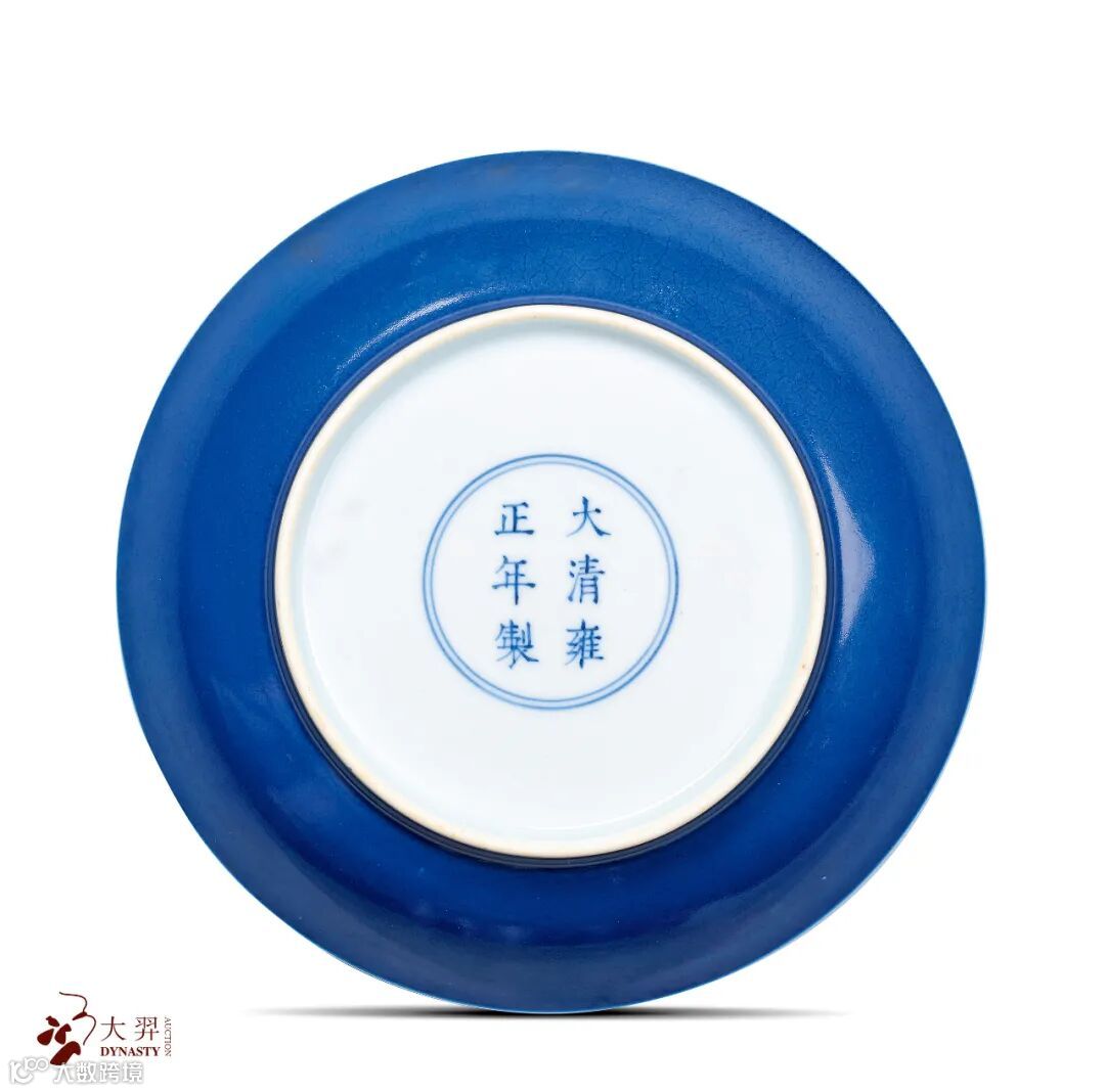 外霁蓝釉内暗刻龙纹盘 款识:“大清雍正年製”六字双行楷书款 直径:19 cm. 记录:香港苏富比,1988年11月15日,编号342