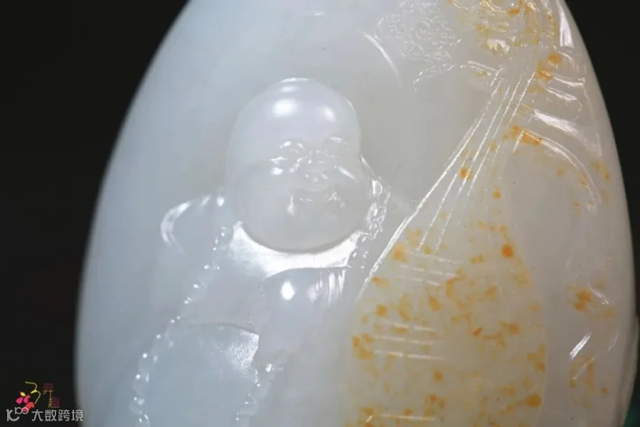 新疆和田玉籽料,局部留有洒金皮,皮色沁人心脾。玉质细腻,温润尤佳。为苏派玉雕工艺,工艺精湛,栩栩如生。雅雕大笑弥勒佛,开脸慈眉善目,满腹欢愉,洒金皮巧雕乐器,寓意佛音,福寿康宁,笑口常开,平安顺遂!