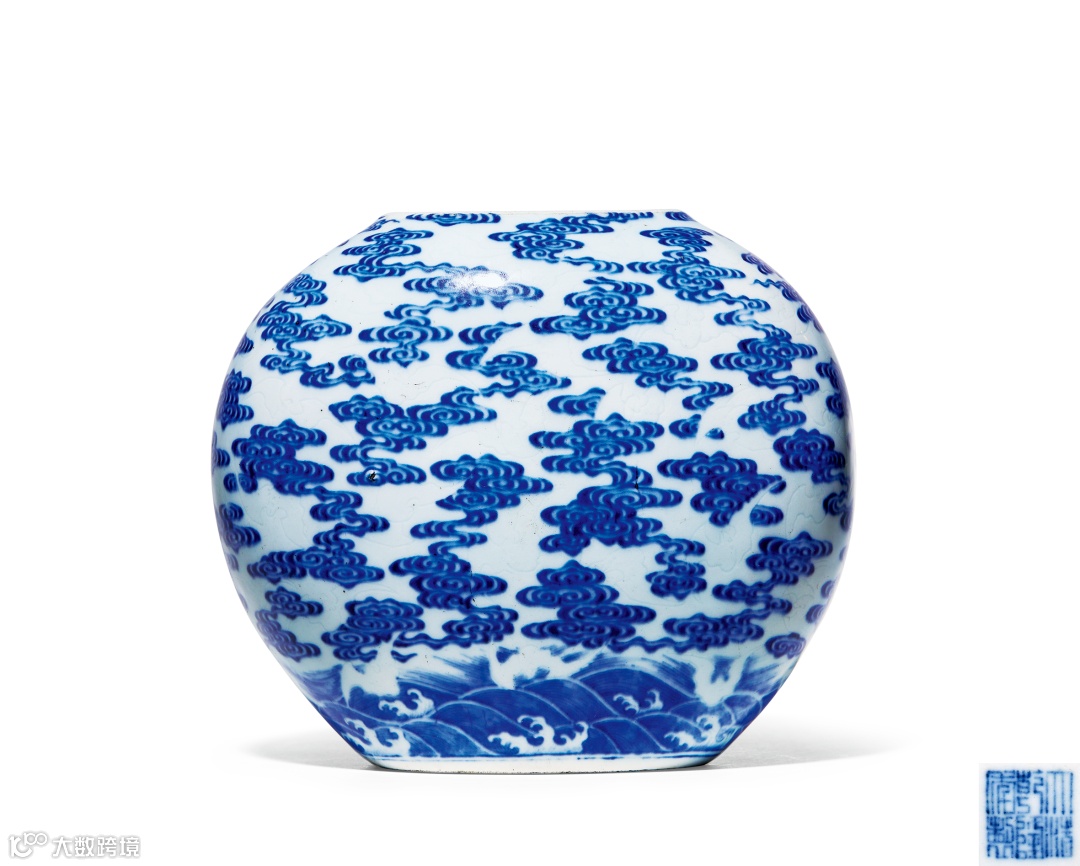 拍品作扁瓶状,施白釉为地,釉质淳厚莹润。瓶身以青花满绘祥云纹饰,留白之间暗刻蝙蝠纹饰,漫天飞舞的蝙蝠于祥云间飞舞,形态各异。整器构图繁密有序,线条流畅自然,绘工精细,色彩明丽,形制沉稳,有洪福齐天、百福拱寿的吉祥寓意。器底书“大清乾隆年制”六字三行篆书款,为官窑经典品类。钓鱼台国宾馆收藏有相同品种,可兹参阅。