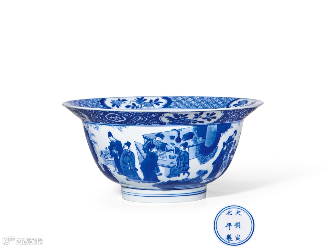 清朝因是外族入主中原,其统治得不到汉族士大夫阶层的支持。为了取得民心、稳定政权,康熙十七年(1678)正月,康熙帝降谕特开博学鸿儒科,即采用荐举与考试相结合的方法,招揽人才,为康乾盛世奠定了深厚的文化基础。在此社会背景下,以十八学士图为主题之瓷器行销一时,成为康熙瓷器之经典装饰图样。碗心于锦地花形开光内绘松石盆景图,内外口沿分别以锦地开光花果纹装饰,外壁通景绘十八学士,或赏画听琴,或对弈读书,故又称琴棋书画图,布局紧凑,场景生动,青花发色鲜艳明快。