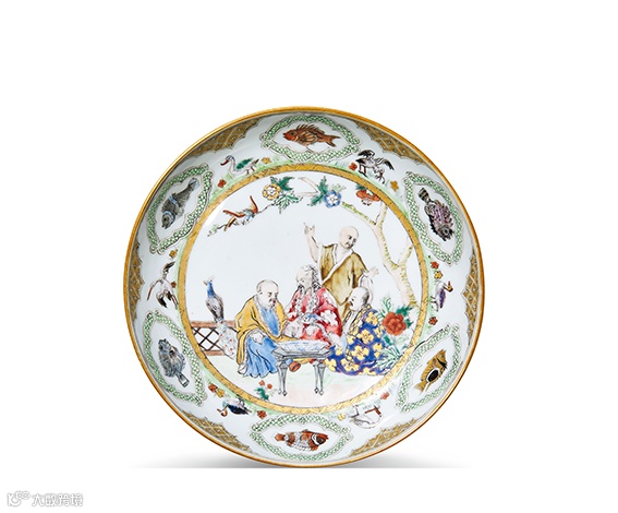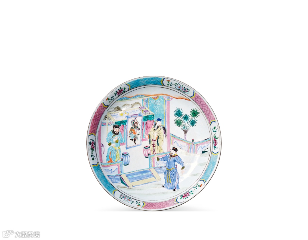 拍品器型硕大周正,施釉润泽,盘心以粉彩绘人物故事图,人物神态生动祥和,笔触细腻流畅,设色雅丽,布局疏朗,带有鲜明雍正粉彩清丽雅致的时代特征。