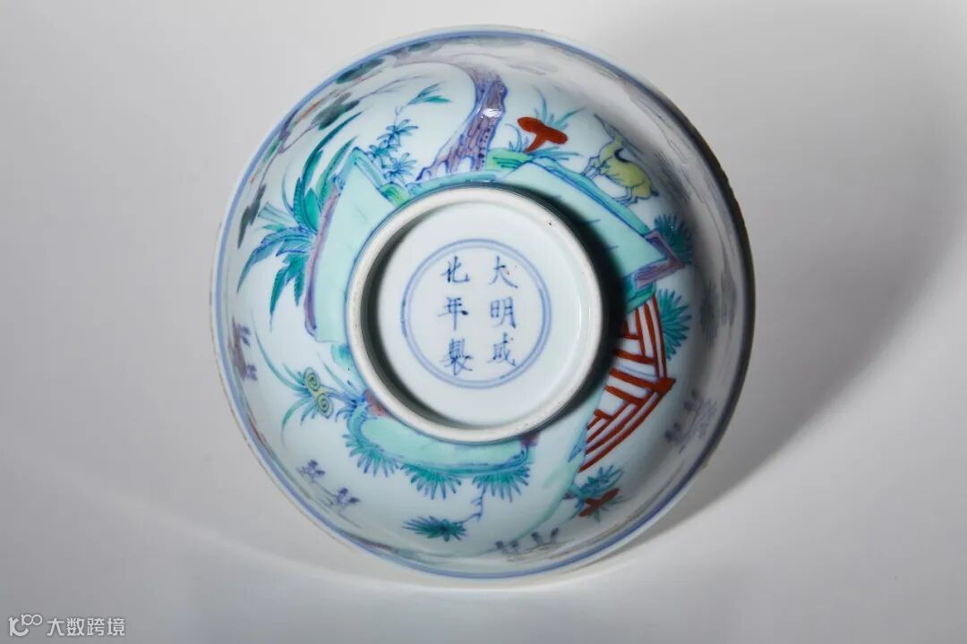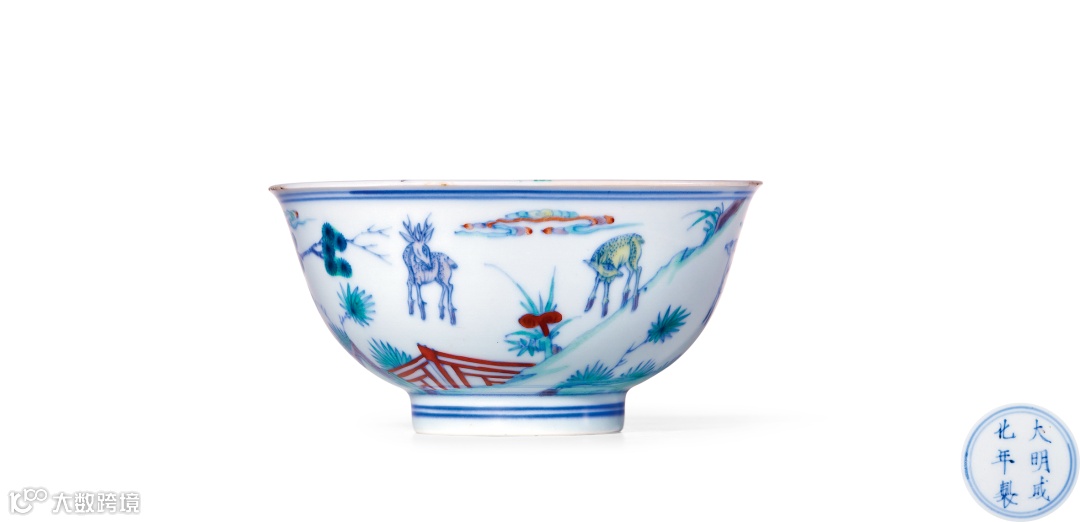 拍品胎体轻薄,釉色洁净。通体斗彩绘长松五鹿图。长松代表长寿,鹿与禄谐音,带有“福禄”之意。外底青花“大明成化年制”楷书款,为典型康熙仿成化斗彩之佳器。拍品典故源于明代画家戴进所画《长松五鹿图》,现藏于台北故宫博物院。