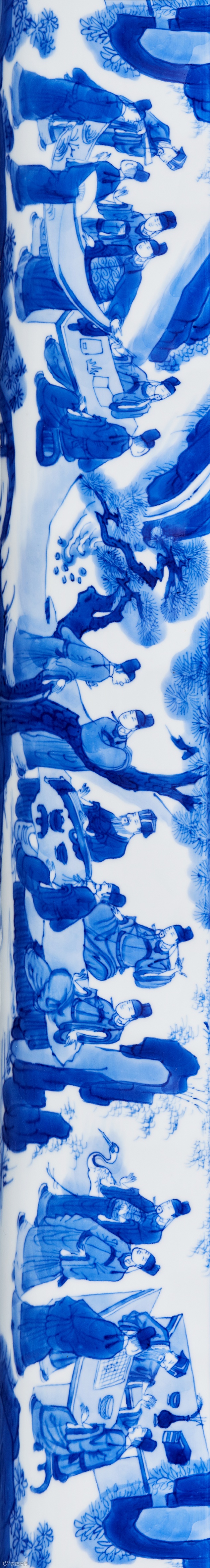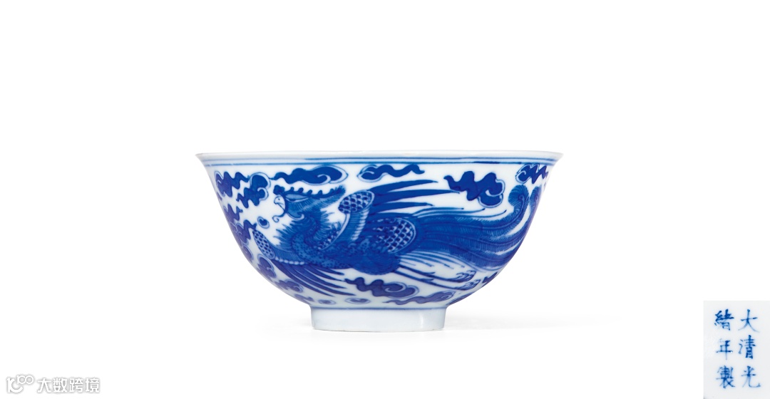 天球瓶是受西亚文化影响衍生而来的瓷器造型,始于明代永乐、宣德年间,状若天球,故名天球瓶。拍品形制硕大,端庄墩厚,圆球腹。器身以青花海水凤纹饰,生动传神,起伏腾跃于海水中,其间波涛汹涌,一派翻江倒海之势。整器装饰风格独特,主题突出,以极为细密的线条排列以表现海水,使得海水更具张力,蓝白分明,气势磅礴,极具立体感。