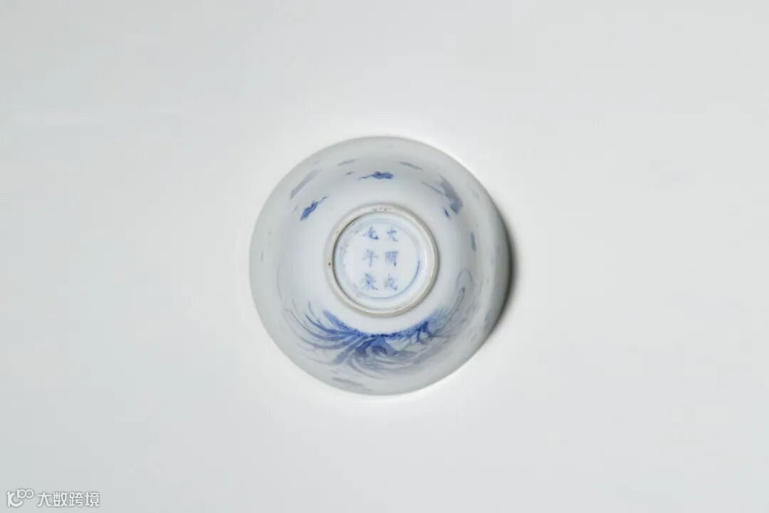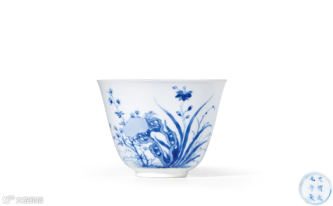 杯撇口,深弧腹,浅圈足。此杯胎釉极薄,色彩柔和雅致。外壁以青花胆描花鸟纹,外底心青花双圈内书“大清康熙年制”六字三行楷书款。