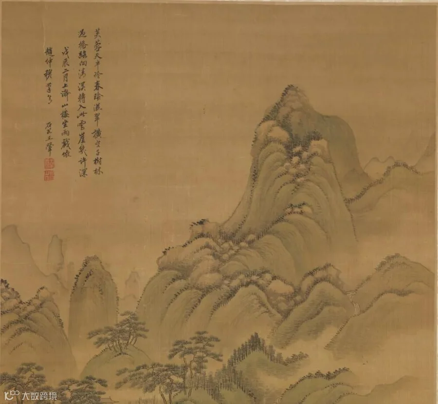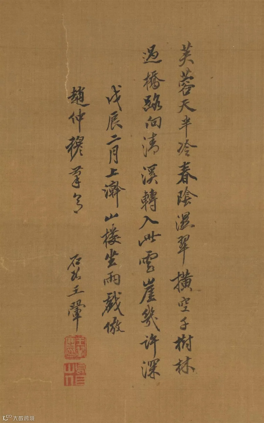 题识:戊辰二月上澣。山楼坐雨,戏仿赵仲穆笔意。石谷王翚。