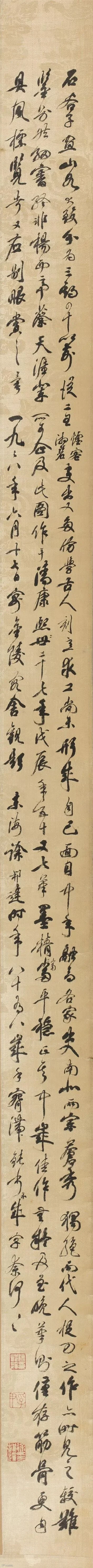 徐邦达题签:石谷子画山水大致分三期:四十以前从二王(烟客、湘碧)变出,又多仿学古人,刻意求工,尚未形成自己面目。中年融合各家,出入南北两宗,苍秀独绝。而代人捉刀之作亦时见之,较难鉴别。然细审终非杨西亭、蔡天涯等所可企及。此图作于清康熙二十七年(戊辰),年五十又七,笔墨精当,平稳正奇,中岁佳作无疑。及至晚,笔则仅存筋骨,更自具风标,览者又应别眼赏之矣。一九九八年六月十七日,寓金陵客舍观题。东海徐邦达时年八十有八岁。手腕滞钝,书不成字,奈何奈何!