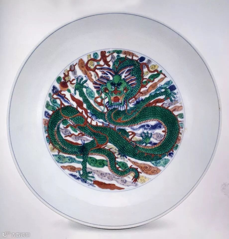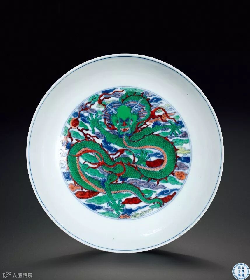 说明:拍品侈口,弧腹,圈足,造型端庄周正,胎骨细白,釉质莹润,盘心双圈内饰迎面立龙,龙敷浓妍绿彩,瞠目伸掌,如横空出世,四周填以五彩祥云,云彩作光芒万丈状,更显雍容华贵,龙舞九天,气势非凡,有清一代唯见康熙一朝方得其神韵,后世清宫御瓷再难出其右。盘外壁绘踏云龙凤一对,寓意吉祥。整器构图繁密,线条流畅自如,设色明快艳丽,画意华美绚烂,与釉下青花相映成趣,成对出现,殊为难得。盘底双圈书“大清康熙年製”六字双行楷书款,工整秀润而不失锋芒,符合康熙晚期风格。