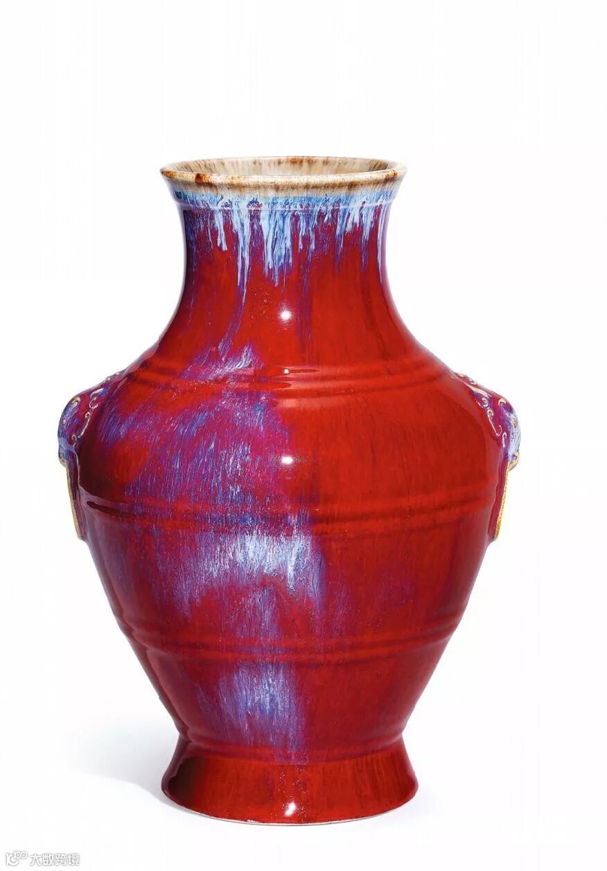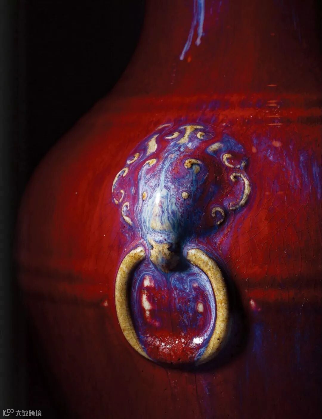 此件窑变釉铺首尊造型在雍正窑变釉中较为少见。翻阅公私收藏,目前仅见本件拍品为唯一孤品,与本拍品相似器型雍正一朝有诸色釉品北京故宫博物院藏有炉钧釉作品,另台北故宫博物院入藏茶叶末釉铺首尊,另南京博物院收藏有乾隆仿汝釉铺首耳尊,可为本品参阅。