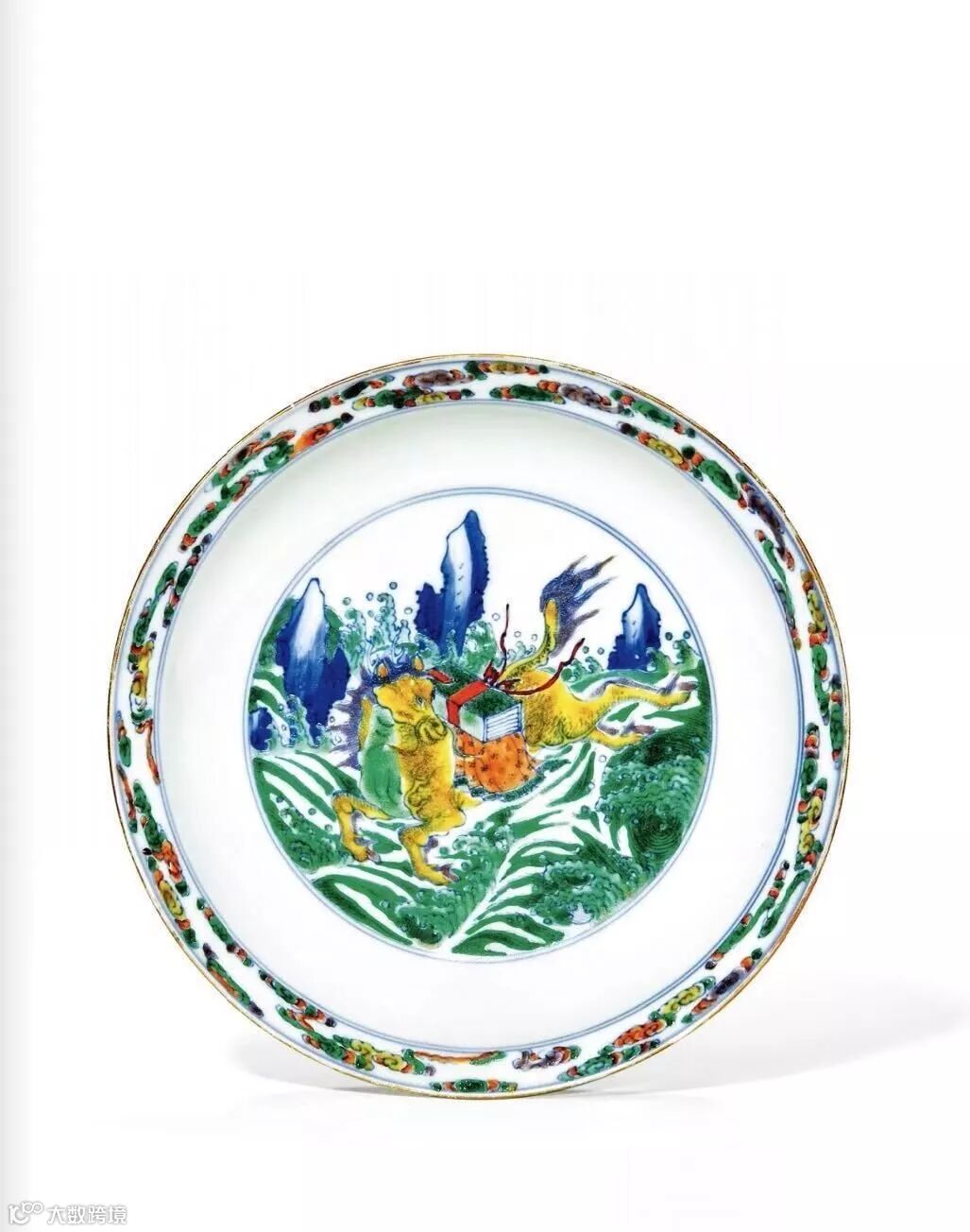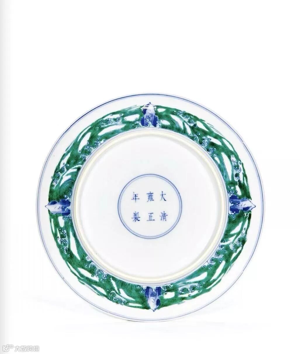 此盘撇口折沿,浅弧壁,圈足。通体斗彩纹饰。描金口。盘心双圈内波涛汹涌,奇石峙立,一龙马背伏一函图书踏浪而来,气势磅礡;折沿饰祥云。盘外壁环饰江崖海水纹,与盘心纹饰互相呼应。底青花双圈内书“大清雍正年制”楷书款。“河图”、“洛书”是中国古代流传下来的两幅神秘图案,是中国术数的根源,也是中国最早的吉祥图案。相传伏羲氏时,有龙马从黄河出现,背上有图点,为河图;夏禹治水时,洛水出现神龟,背上也有图典,是为洛书,两者皆为“天授神物”。始祖伏羲根据这种“河图”和“洛书”画成八卦,创始了炎黄文化。