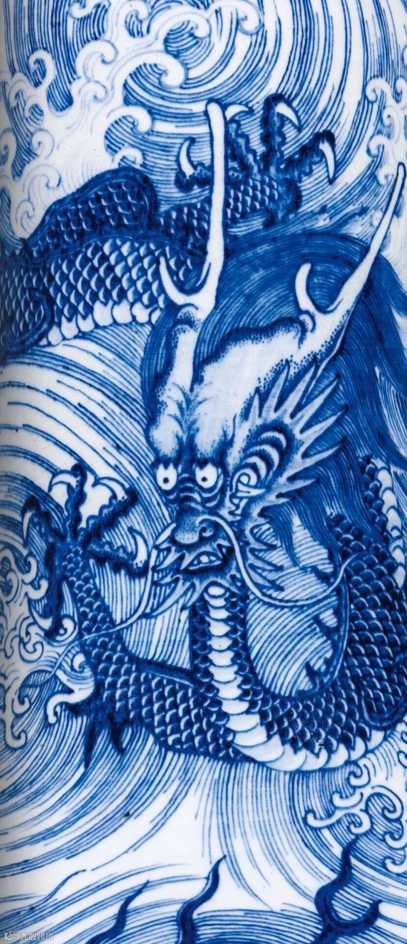 苍龙教子图作为清宫御瓷装饰题材始见于雍正一朝,至乾隆后期,苍龙教子图成为御瓷之中寓意特殊的一类,存世数量珍稀。此天球瓶直颈粗壮,腹部浑圆,圈足。器身外壁以青花满绘云龙出海,留白处绘海浪翻滚。颈及腹部通体满绘腾龙图案,青花绘浪花翻卷,汹涌澎湃;四龙于浪花中腾跃,口齿怒张,须发披散,气势磅礡,共同追逐前方的火珠,肌肉鼓胀,龙爪锋利尖锐,气势撼人。本品底不落款,《清档•雍正记事杂录》中有奉皇帝旨意“俱不要款”的记载,可见本拍品亦为奉旨不落款之御用陈设用瓷。