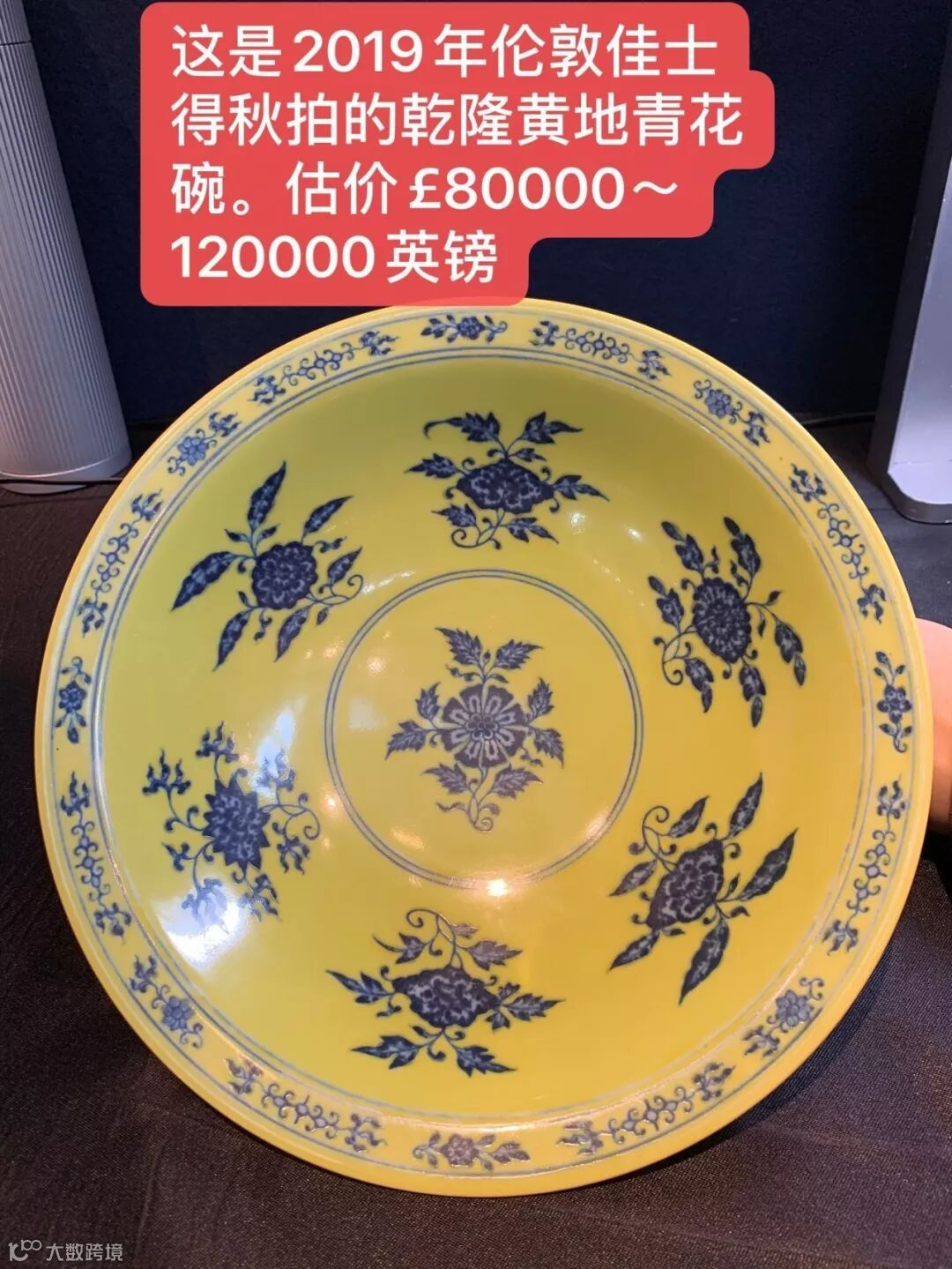 上图这件伦敦佳士得今年秋拍上的黄地青花碗与此次大羿的这件柠檬黄地青花碗颇为相似,估价在8到12万英镑。而大羿的这只碗又会以什么样的价格落槌呢?我们【鸿观收藏】会积极关注,到时候与大家共享。