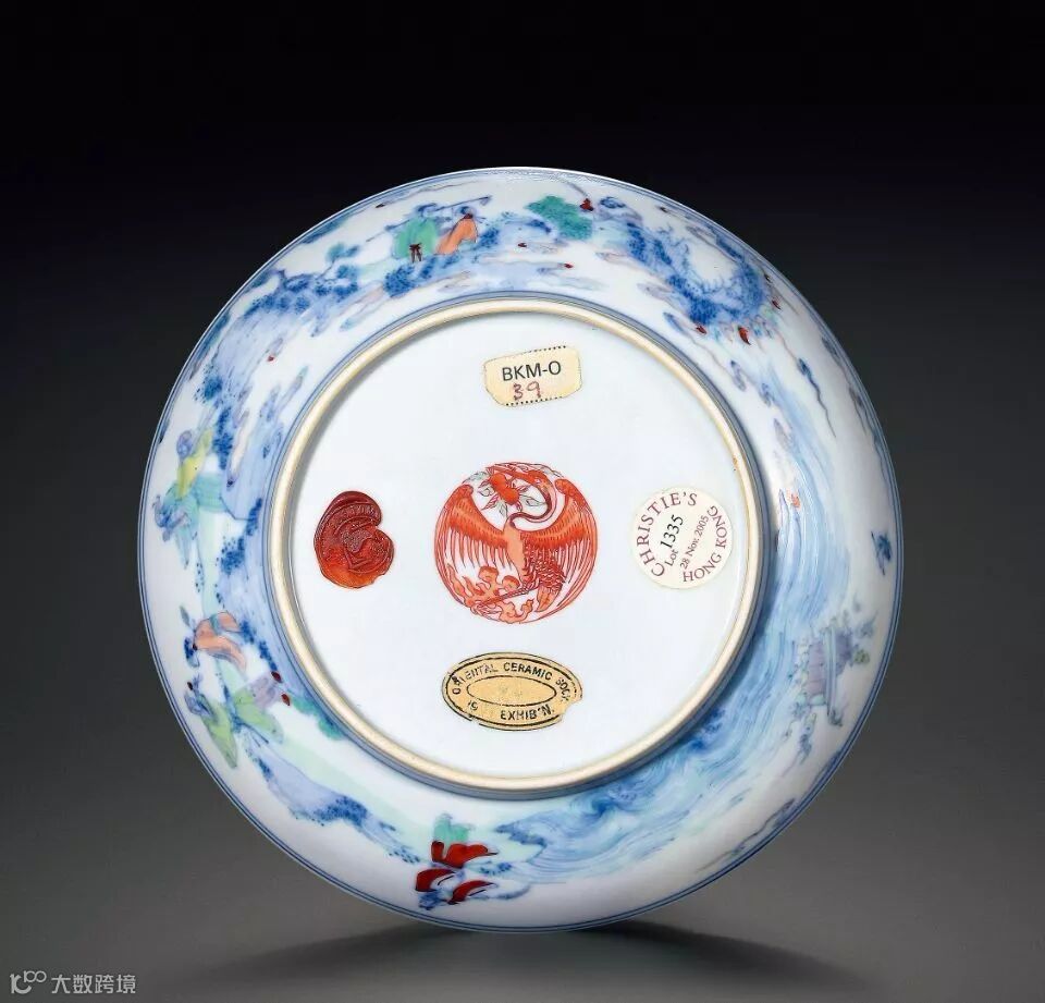 前述题材相类的斗彩盘多署官窑年款,故宫所藏盘底以矾红绘团鹤衔桃纹为款识,契合祝寿用意,极为少见独特。尚见一例明宣德青花团龙纹菱口洗,底部以青花团龙取代年款。