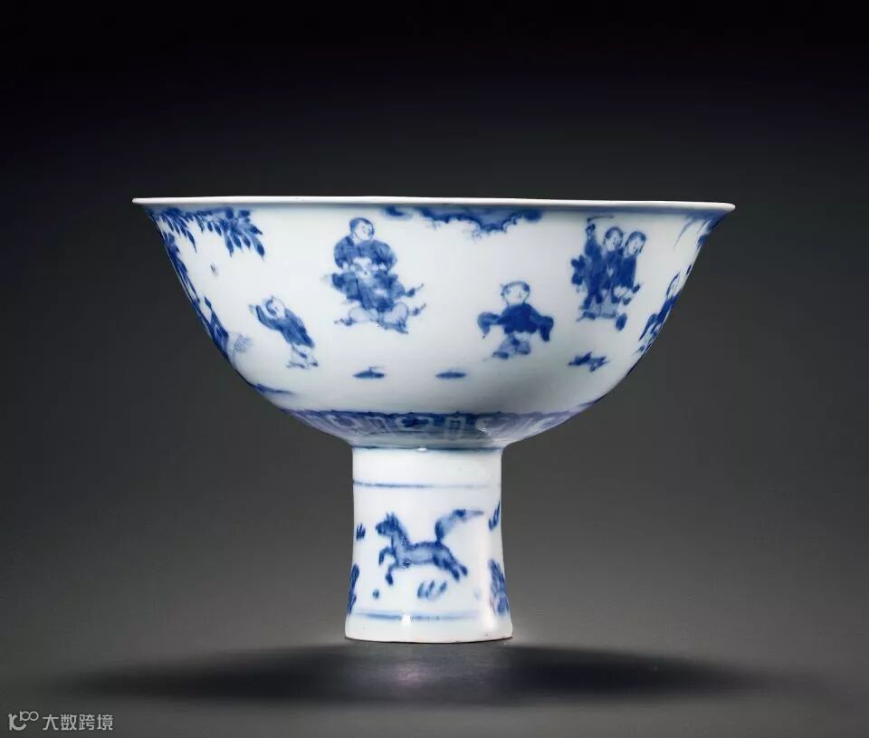 说明:拍品敞口,弧腹,高圈足。造型典雅俊秀,线条柔美流畅,胎质细薄坚致,釉质莹白凝厚,抚之润泽似玉,内底绘寿山福海,外绘婴戏图,或蹴鞠,或放筝,或骑行马,或捉迷藏,将孩童的天真烂漫表现的淋漓尽致。高足碗又称靶碗,始于元代,成化及明清多有仿制,此碗胎质细腻,白釉肥润泛青,十分肥厚,青花采用平等清料,清雅怡人。一改永宣浓重之习,焕然一新。