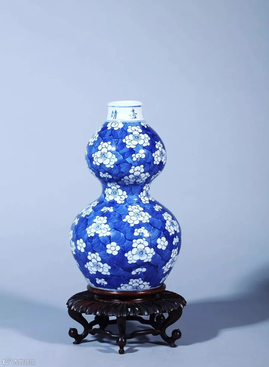 瓶作葫芦式,身作蓝地,上施冰纹梅花。以青花为地,色翠蓝,梅花为白色,胎质细白坚致,釉色肥润。通体以青花浓料为底,以青花淡料略加晕染,其间勾画白色梅花,蓝白相映,寒梅吐艳尤显芬芳,颇具文人画风韵。