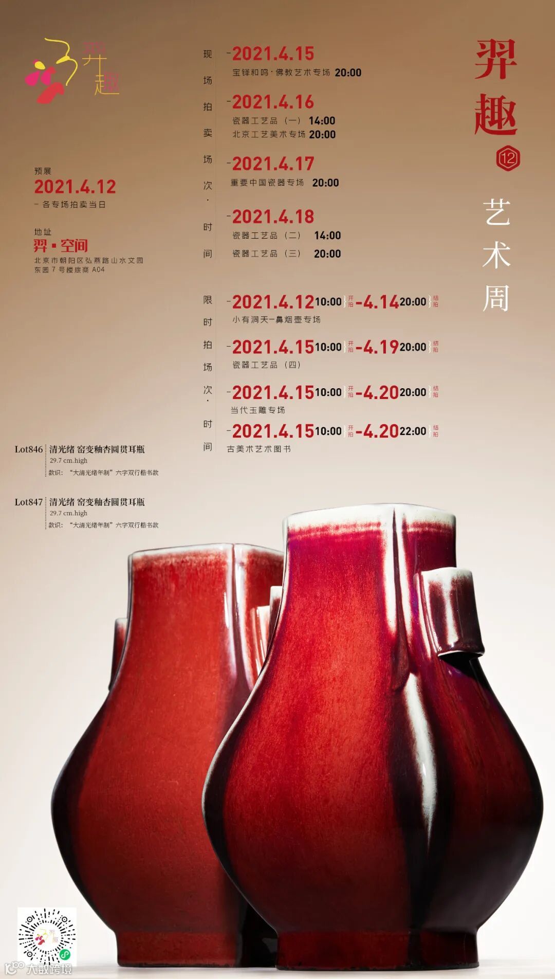本次羿趣12·艺术周将继续借助网络的力量为各位带来多元的艺术盛会,共有10个专场,其中6个同步直播拍专场,从4月15日晚8点起,每日拍卖不间断,精美佳器,优质服务,期待您多多参与。除此之外,还有4个限时拍卖,包含了瓷器、鼻烟壶、当代玉器、古美术艺术图书等门类,会在预展期间逐一开启竞价。