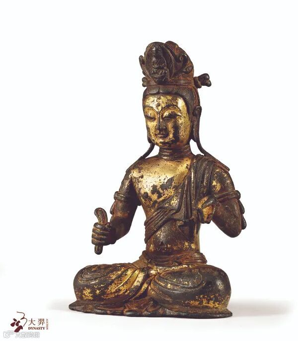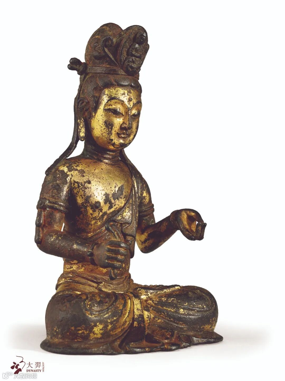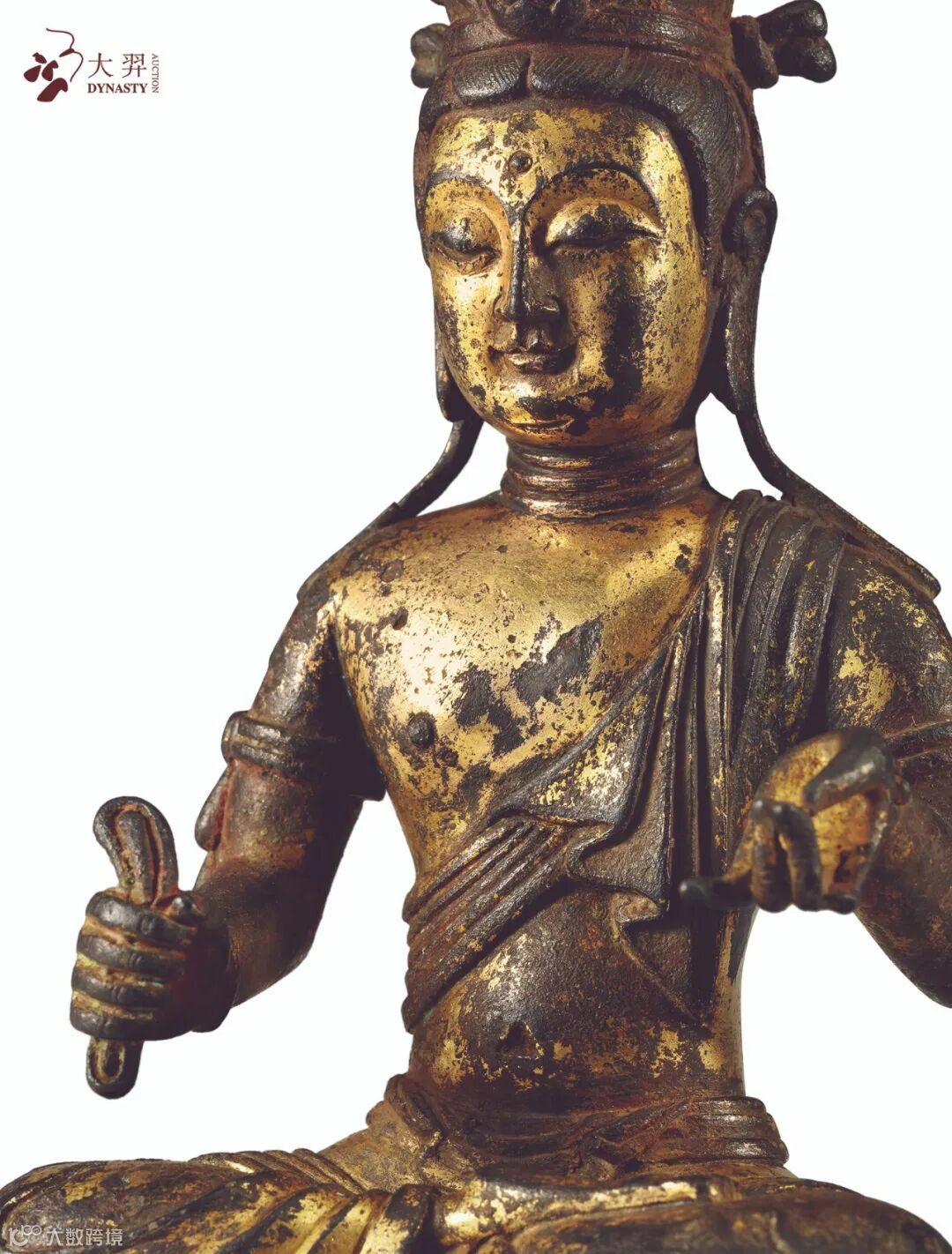 此像头戴峨冠,饰有化佛。发髻高耸,余发垂搭双肩。面庞圆润,有唐代遗风,长眉高挑,斜入鬓角,双眸凝视,容貌严肃,使人感到并非冥心内敛,而是在冷静观察、积极思考外界之形形色色。嘴唇闭拢,口角低凹,又显示具坚定信心去完成宏大心愿。斜坡绶带,搭巾外翻,表现出内地造像的写实技法。双臂屈肘微微抬起,肢体表现自然。此尊造像与纽约大都会博物馆所藏一尊宋辽时期童子像,造型工艺如出一辙,体现出高度的一致性,极具收藏价值。