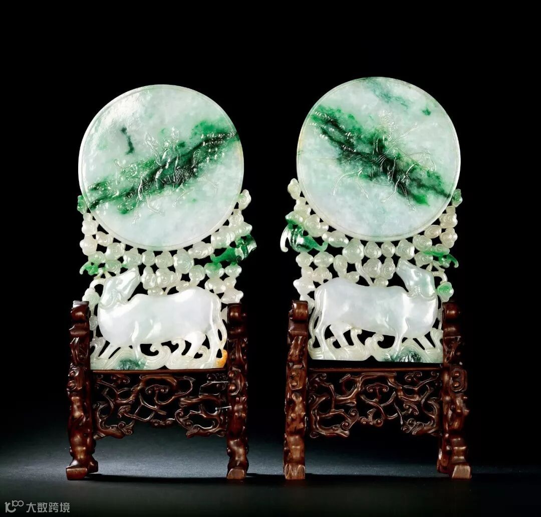 此对插牌翡翠材质,翠色喜人,充盈通秀。下半部分均为杯形,图案对称,主要采用镂雕手法,雕有牛、蝠纹和如意云纹,布局合理,寓意吉祥。上半部均为圆形若镜,正面雕刻人物图,背面阴刻诗文,图案诗文内容一致。诗文后均落“乾隆年制”款。一牌正面雕进士骑马图,背面阴刻诗文:“雁塔题名罢,琼林赐宴回。”雁塔题名,进士及第的代称。雁塔即大雁塔,在陕西西安的慈恩寺中。为唐玄奘所建。唐朝新中进士,均在大雁塔内提名。故以“雁塔题名”代称进士及第。琼林赐,是为殿试后新科进士举行的宴会。始于宋代。另一牌雕人物降麒麟图,背面阴刻诗文:“嵩岳生申甫,郊薮降麒麟”。语出《诗经•大雅•崧高》:“崧(嵩)高惟岳,峻极于天。惟岳降神,生甫及申。”甫,指甫侯,周穆王时大夫。当时,边境各族反抗,诸侯不睦,社会秩序不安定,甫侯辅佐穆王推行法治。申,指申伯,为周宣王之贤卿士。《崧高》一诗,就是申伯去封地谢筑城时,大夫尹吉甫所作为他送行的诗。后来便以“嵩生”、“岳降”用作祝寿之词。两插屏文意相应,共祝君子金榜题名,大展宏图。总而观之,此对翡翠人物题诗插牌用料华美非常,造型古朴典雅,设于雅士案头,有恭勉励志之美意。