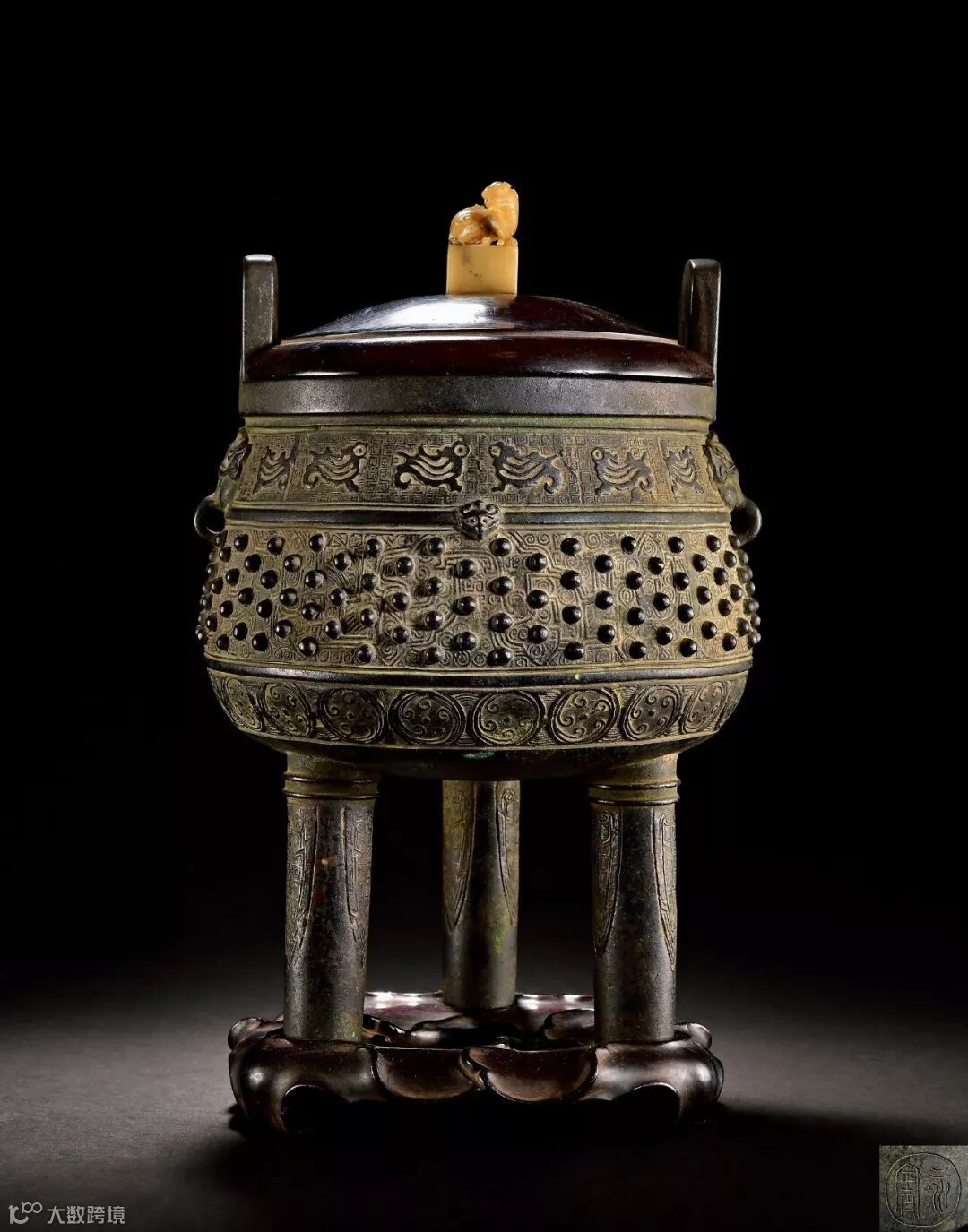 拍品仿造上古商周时期青铜鼎的形制而制。铜鼎立耳、鼓腹、三足,腹部有乳钉兽面纹装饰。蕴华丽于古雅之中,具有强烈的装饰效果。