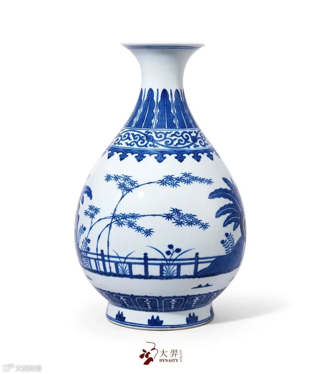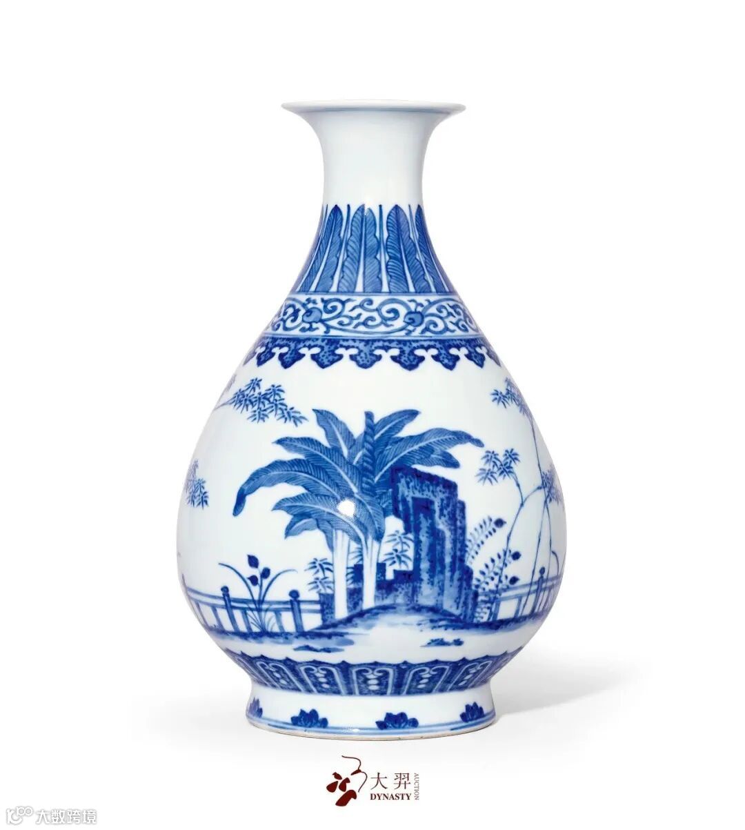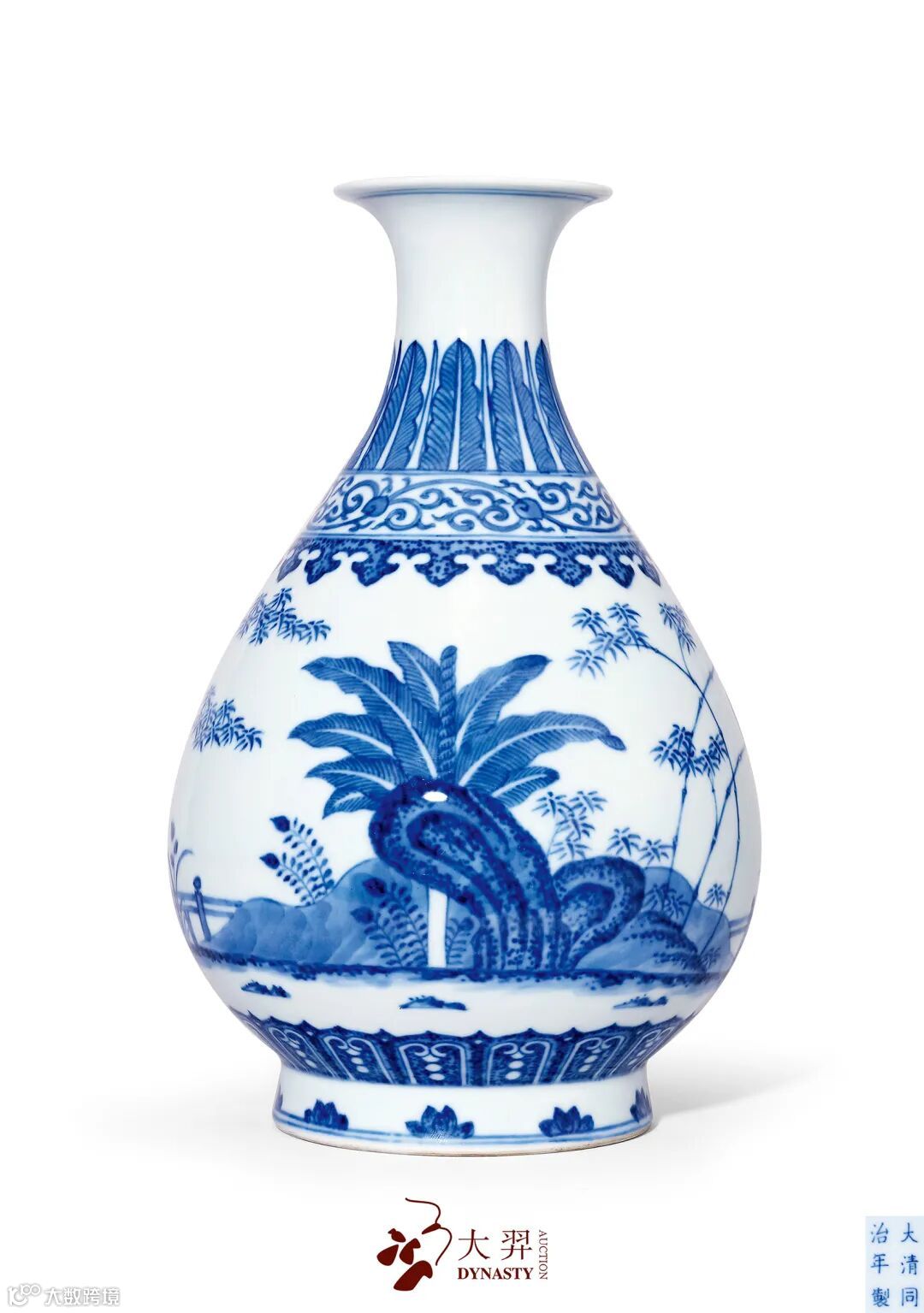 瓶撇口,长颈,圆腹下垂,圈足略高微外撇。颈部绘蕉叶纹,下绘卷草和变形如意头纹,腹部主题图案绘翠竹、芭蕉、洞石、花草和栏杆,近底处绘变形莲瓣,足外墙绘朵花纹。此瓶造型优美,线条流畅。颈变粗短,腹部加大,是清代晚期玉壶春瓶的标准式样。其青花发色趋于淡雅,纹饰富有层次感。玉壶春瓶造型优美,婆娑婀娜,瓶式由诗句“玉壶先春而得名”。造型由唐代寺院里的净水瓶演变而来。基本形制为撇口、细颈、圆腹、圈足。玉壶春瓶的器型最早是一种装酒的实用器具,后来逐渐演变为观赏性的陈设瓷。此件官窑款的玉壶春瓶,造型极具线条之美,俊逸典雅,圆润饱满,青花至美臻纯,瑰丽璀璨,美不胜收,实乃同治官窑同类作品之典范佳作。