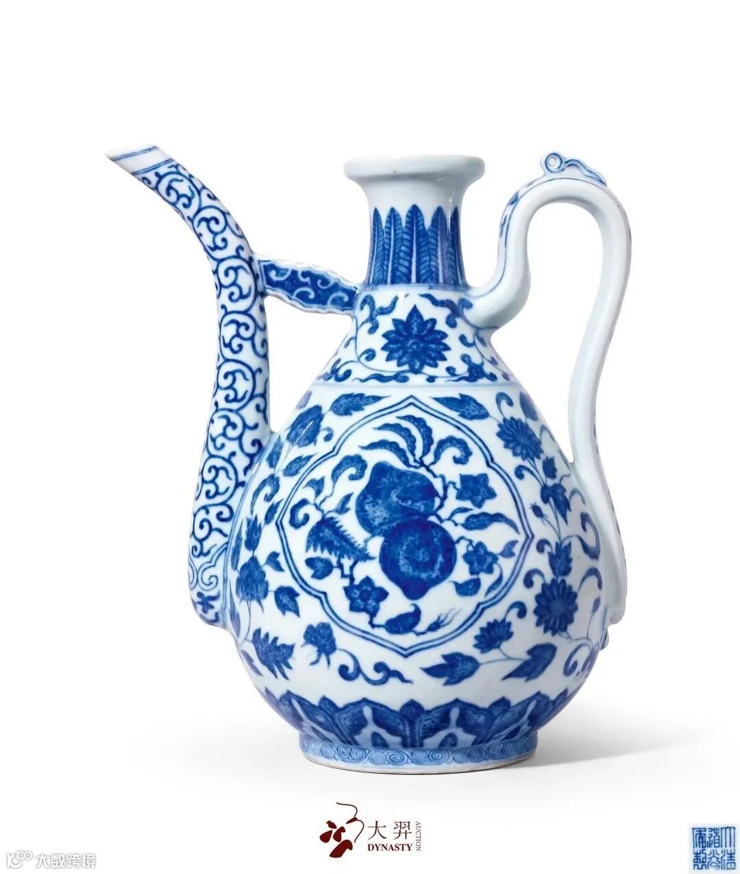 清代青花花果纹执壶,其样式和装饰花纹均仿自明永乐官窑,以乾隆朝生产较为多见。拍品与香港中文大学文物馆展出的关氏藏品和西藏博物馆藏品相同,为道光时期沿烧的传统品种,传世较少。