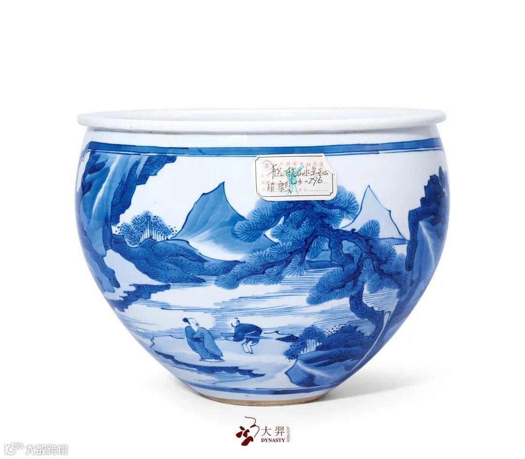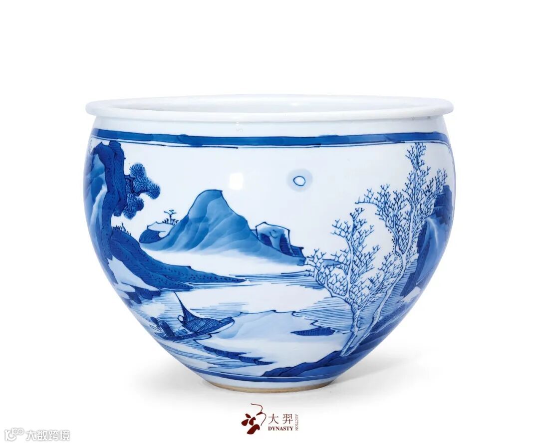 本品是为文人的案头之物,唇口圆弧腹,平底,胎色洁白,胎质细腻紧致。小缸内外通施白釉,里釉白中闪青,外釉洁白,外壁以青花描绘山水图,青花发色深艳浓丽,山石树木描绘无不精细,意境高远。在明末清初这个瓷器大发展时期,瓷质文房用具以其多样化的造型、丰富多彩的装饰纹样越来越受到文人士大夫的青睐。青翠浓艳的青花发色更有利于体现淡泊高远的文人意趣,故而这一时期的青花瓷质文房至今都备受喜爱。