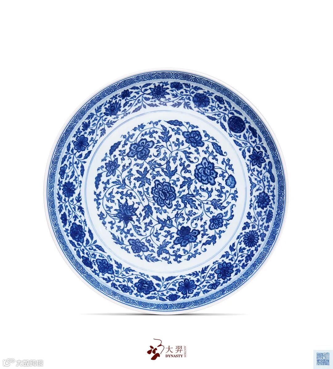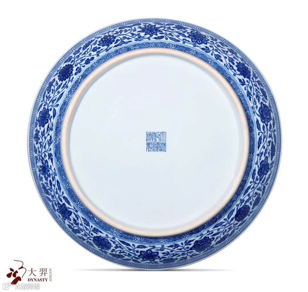 乾隆青花瓷与清幽的康熙青花有别,以纹饰繁密、染画工整、色彩亮丽、造型新奇取胜。可见LOT214清乾隆青花缠枝花卉纹大盘拍品形制规整,胎质细腻,清韵可人,盘心及内壁均以青花描绘各式花卉纹样,与盘心纹饰相互呼应,藤蔓缠绕,花朵娇娆,安放有序,构图满密清晰,绘画流畅细腻,纹饰鲜活传神,青料浓淡兼施,苍翠欲滴,实为佳品。底书“大清乾隆年製”六字三行篆书款。