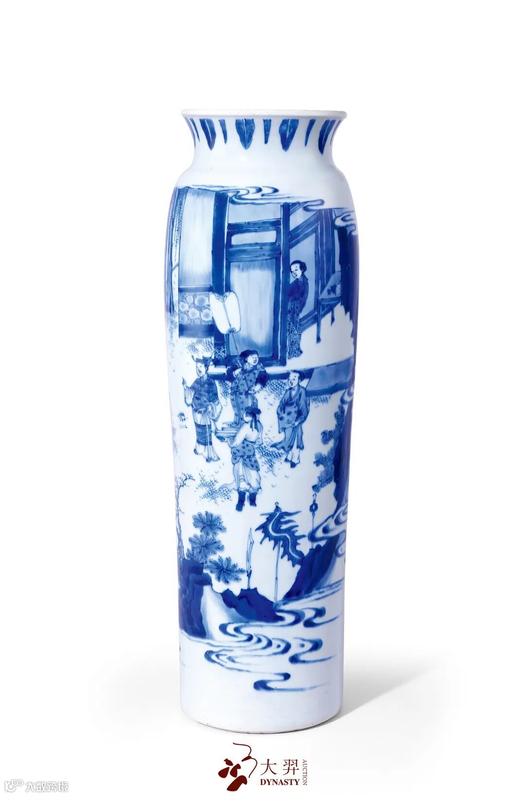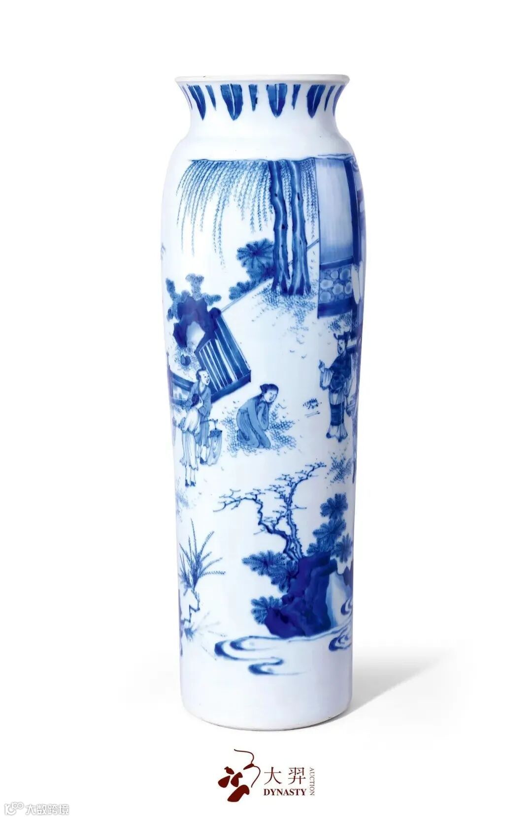 直至明末万历后期开始,明代官窑停止了烧瓷,开启了瓷器的过渡期,过渡初期的青花瓷大多制作粗糙,这和当时因经济衰退而造成的消费能力下降有关。直至崇祯期间,尽管外忧内患,朝野动荡,国力衰退,财政紊乱。但是尽崇祯青花却登上了一个空前繁荣的景象,其风格鲜明、独树一帜在明末清初青花发展史上起到了承前启后的作用。那是画意转变,下启康熙瓷画流行戏剧故事人物之先声,开一代未有之潮流。本次北京大羿2021春拍中“无瑕:重要中国瓷器”专场中LOT213明崇祯青花人物故事图筒瓶具有典型明末时期的风格,譬如画面中地上的“V”形草纹,山石边的鱼卵状叶片,中茎留白的蕉叶纹,皴染画法的山石,平行括号状的浮云以及蕉叶山石旁的椿叶点,如此诸多特点俱是典型标准器之要素。