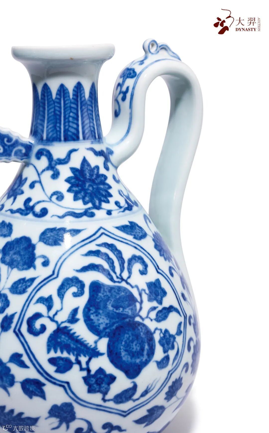 执壶全器以青花为饰,自颈部而下分层绘蕉叶纹、缠枝莲纹、缠枝四季花卉纹、莲瓣纹、卷草纹,腹两面菱形开光,一面内绘折枝双桃,另一面绘折枝枇杷,壶流饰卷草纹,柄上随形开光内绘四枝灵芝;纹饰均沿袭自永乐时期。器形秀美,白釉清莹透澈,肥厚温润,青花发色明亮,局部花纹以重笔点染,以模仿永乐“苏麻离青料”的效果。